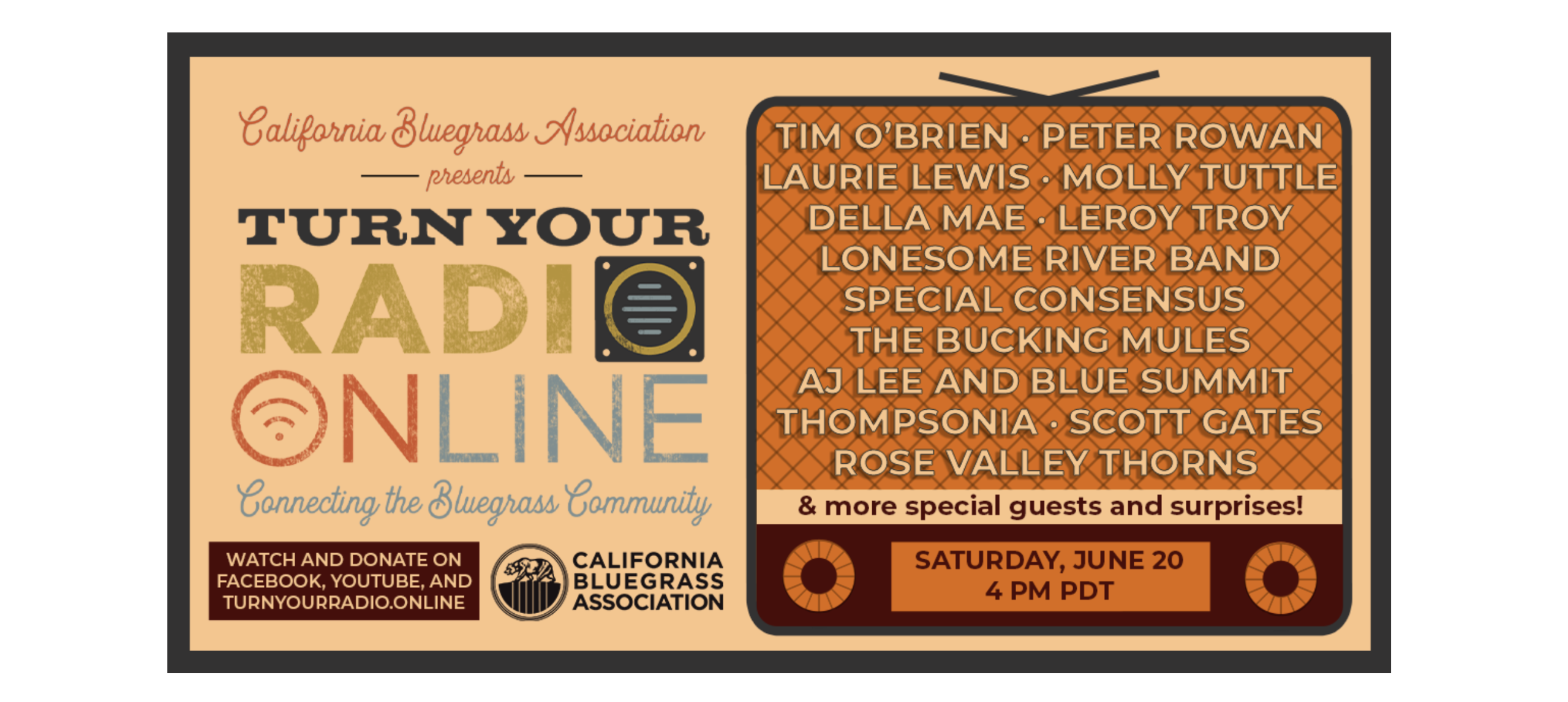 Turn Your Radio OnLINE – a live stream performance webcast series featuring exciting California and national artists. The California Bluegrass Association will be producing a series of live webcasts, and a silent auction — all to connect our music community and raise much-needed funds for musicians during these tough COVID times.