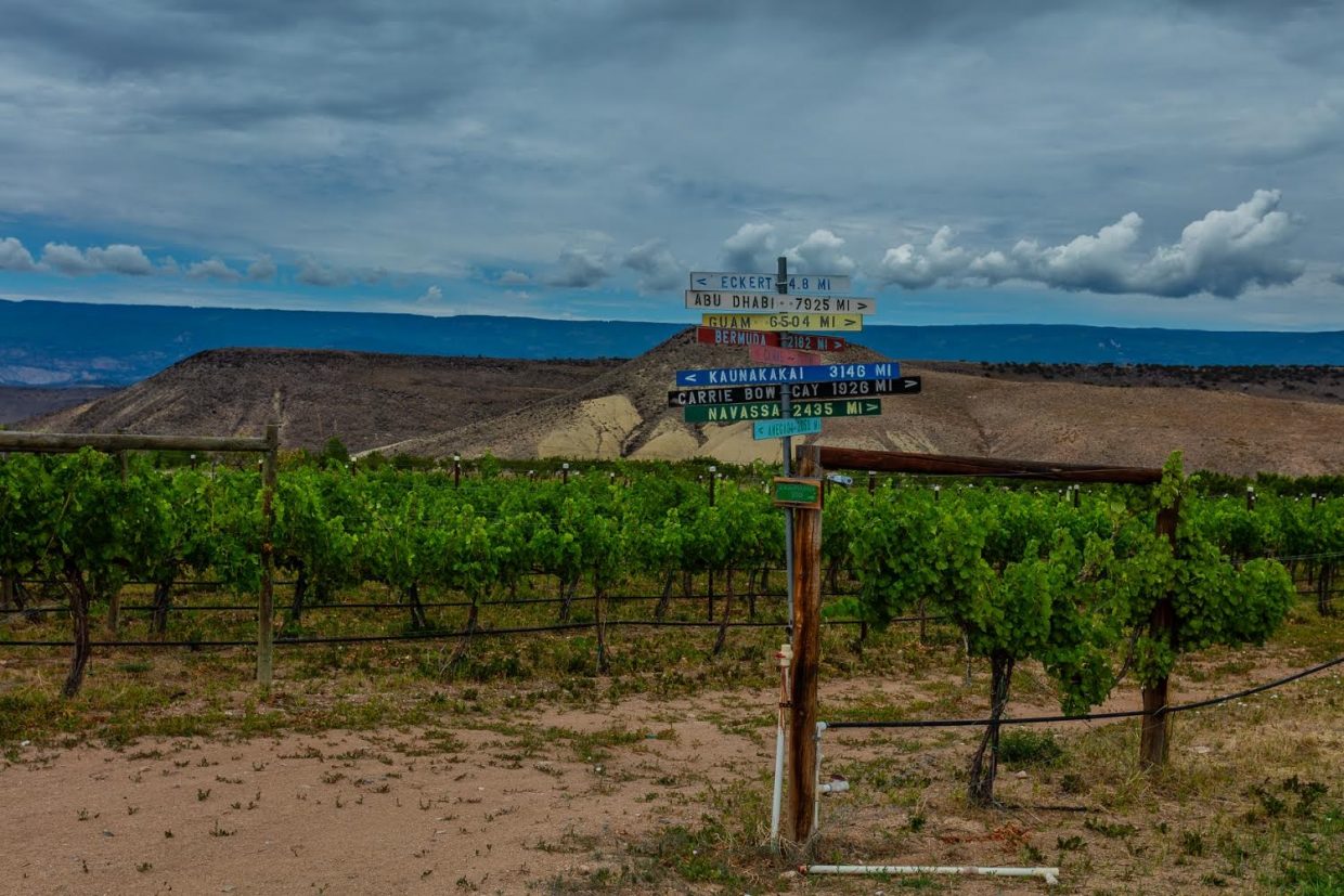 Wineries: In addition to the fruit orchards in the area, grapes seem equally at home in the soil around the Grand Mesa. The Surface Creek Valley has seen several vineyards take hold in recent years. The town of Palisade, located to the west of the Mesa, boasts numerous wineries and vineyards. The sign seen here is from I-Guana Farm on Cedar Mesa.