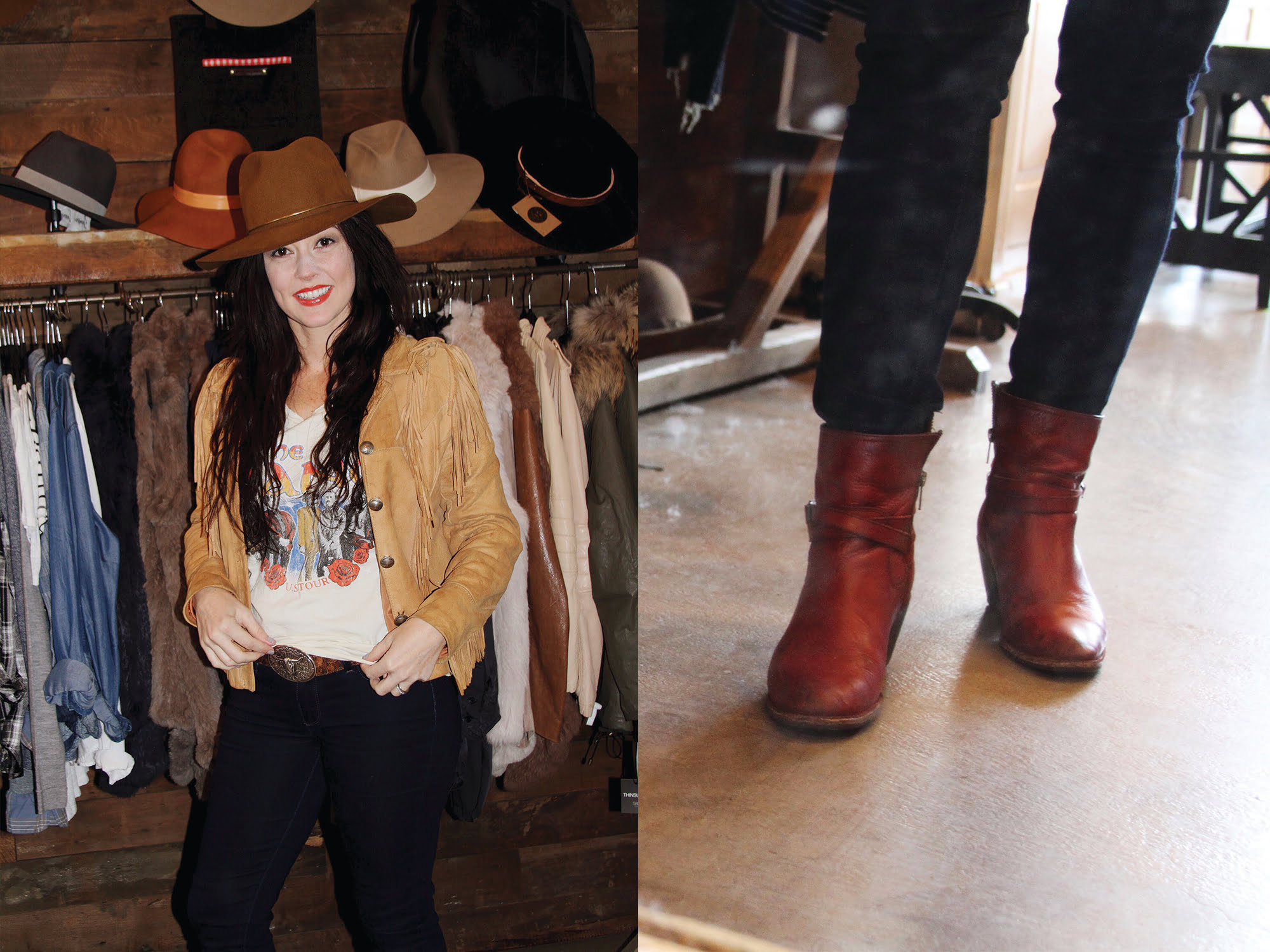 Amanda Shires is one of my favorite people to travel with and she happens to have a killer hat collection. Also from Texas, she’s a lover of quality hats like the Stetson, and is always introducing me to new hat makers and designers. When I met up with Amanda a couple of weeks ago, she was rocking an awesome, wide-brimmed hat from White’s Mercantile. What really set the hat apart for me was the thin gold metal hatband. Needless to say, this lead to a fun afternoon of trying on the Mercantile's great selection of hats. The two beautiful hats shown in the photos are James (brown) by Janessa Leone and the Floppy Brim Fedora by Rag and Bone (black). Amanda wears them with some of her favorite Midnight Rider t-shirts.
