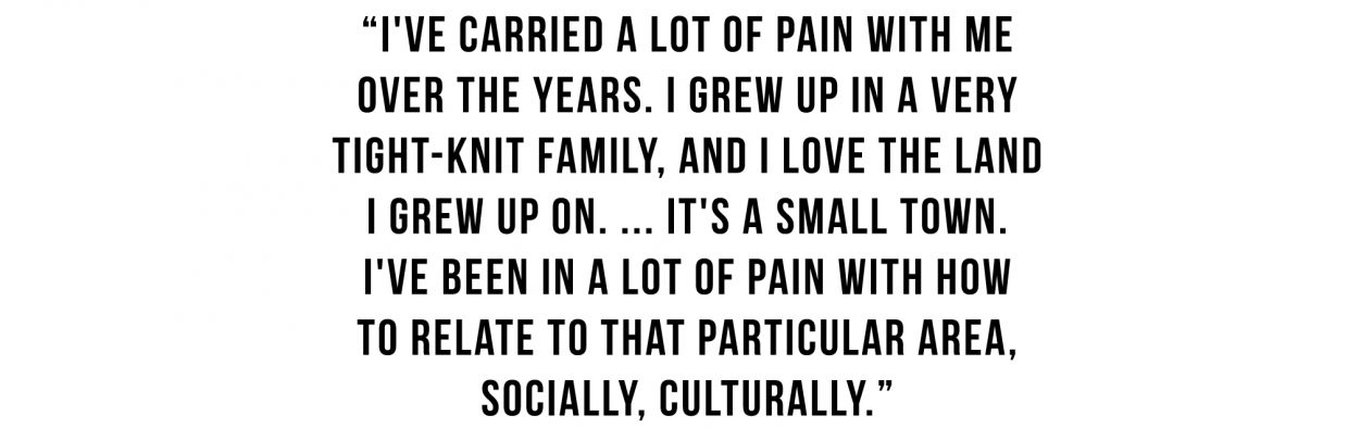 When I wrote that, I was imagining the land I grew up on — the road I’m talking about with my family — and I think it also was inspired a little bit by … several years ago, I learned that my parents had bought my brother and me this plot in the church cemetery. That is actually a normal thing to do, just buy up a whole thing so your family can be together, but it made me think what that actually meant. I’ve carried a lot of pain with me over the years. I grew up in a very tight-knit family, and I love the land I grew up on. It’s in the foothills of the mountains in western North Carolina; it’s a small town. I’ve been in a lot of pain with how to relate to that particular area, socially, culturally.