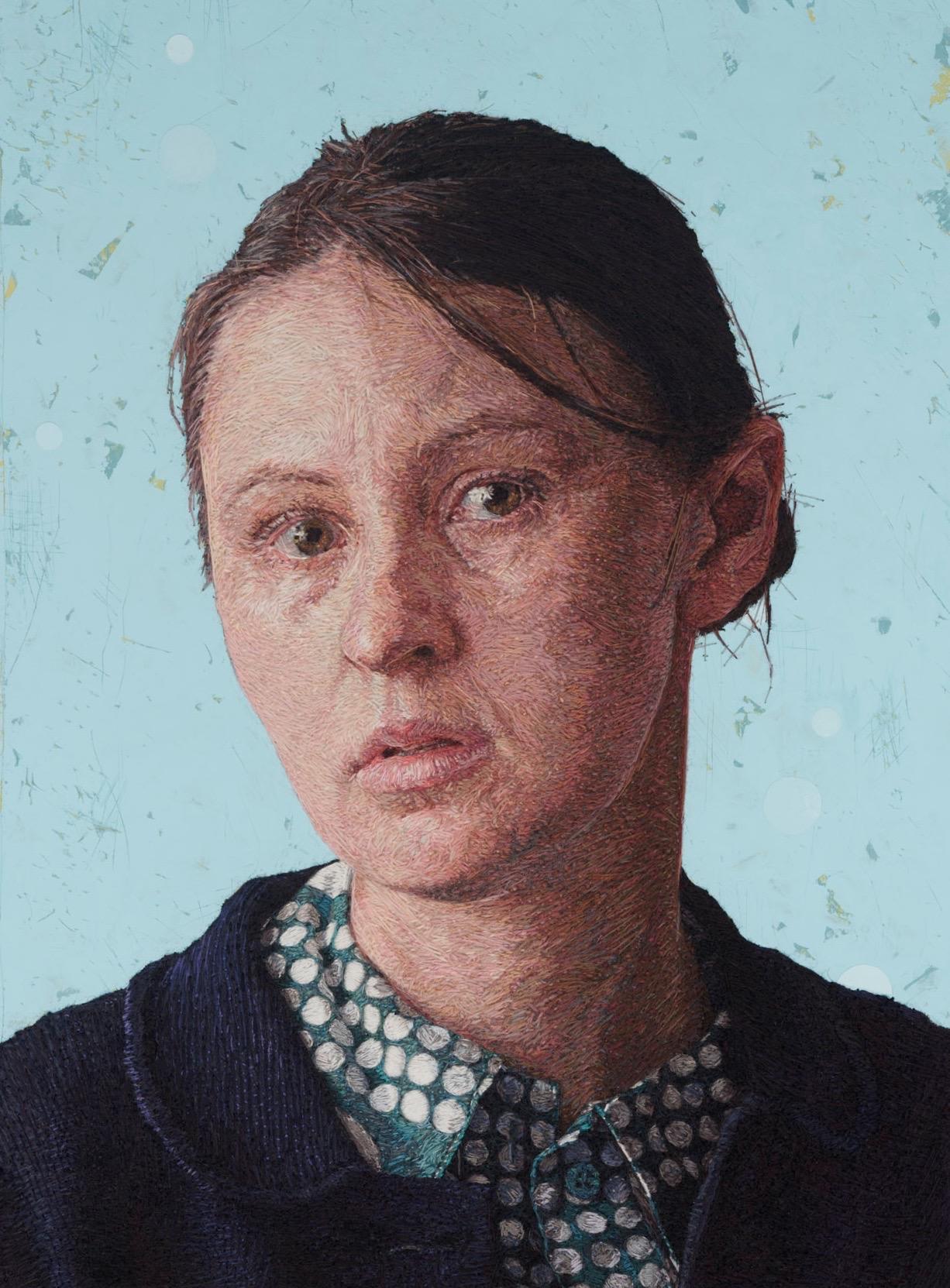 Over the years, the technique has become more and more obsessive. In the beginning, I was trying to figure out how to create the illusion of hair, flesh, and cloth out of wool … the stitches were much looser and I used fewer colors. Because I was not trained in embroidery, I did not quite know what I was doing, but knew what I wanted the end product to look like. I practiced “renegade embroidery,” making up my own stiches and relying on my background in drawing and painting to use thread as a drawing tool and attempt a portrait. The making of each piece was the “on-the-job training” that informed the technique of making the next portrait.