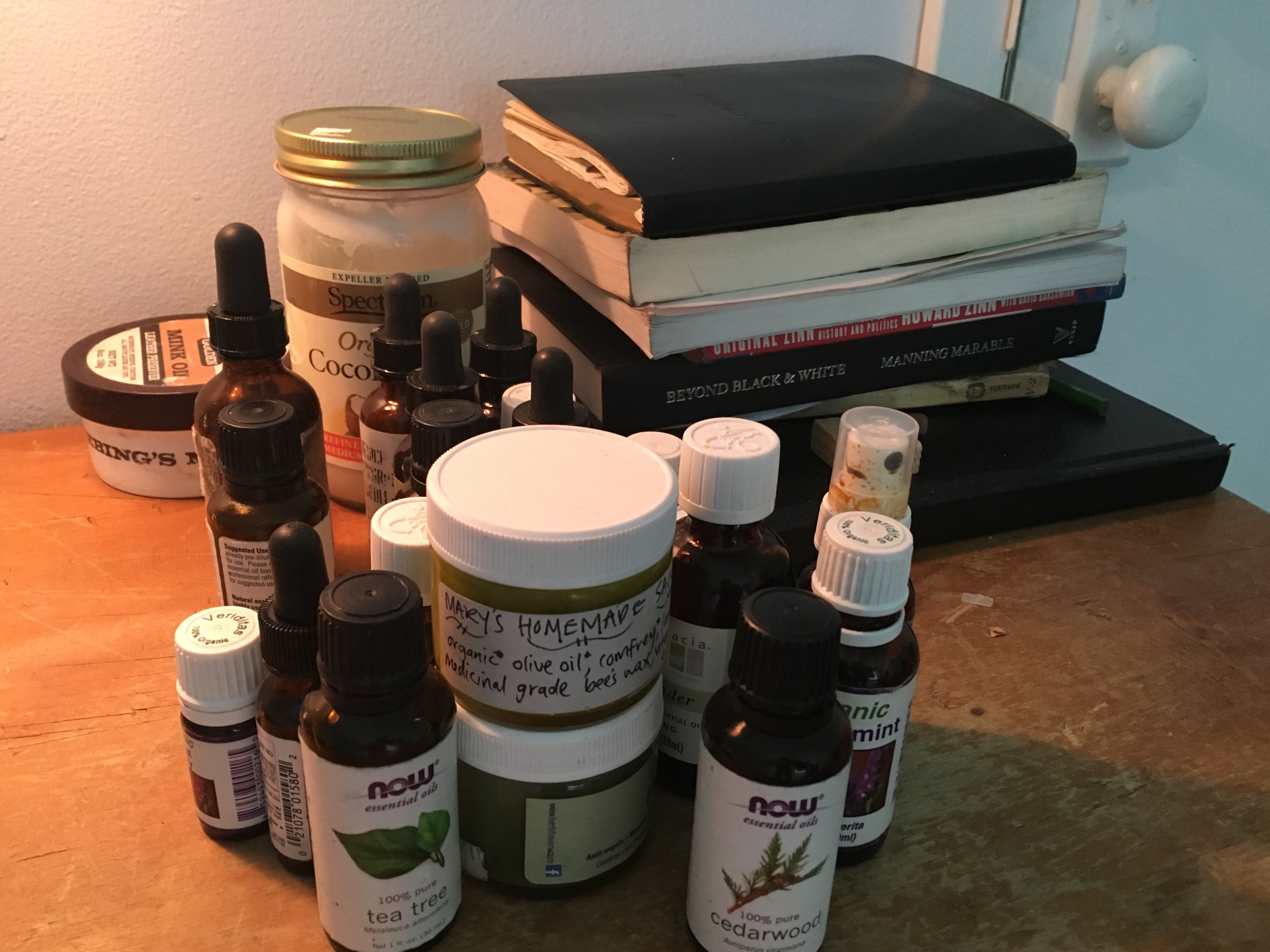 Essential oils: I keep lavender, frankincense, peppermint, titri, cedar wood, coconut, and my friend Mary Remington's handmade beeswax and comfrey vitamin lavender Olivia oil salve. They are medicinal and healing, and help me control my personal environment in the constantly changing paradigms of touring.