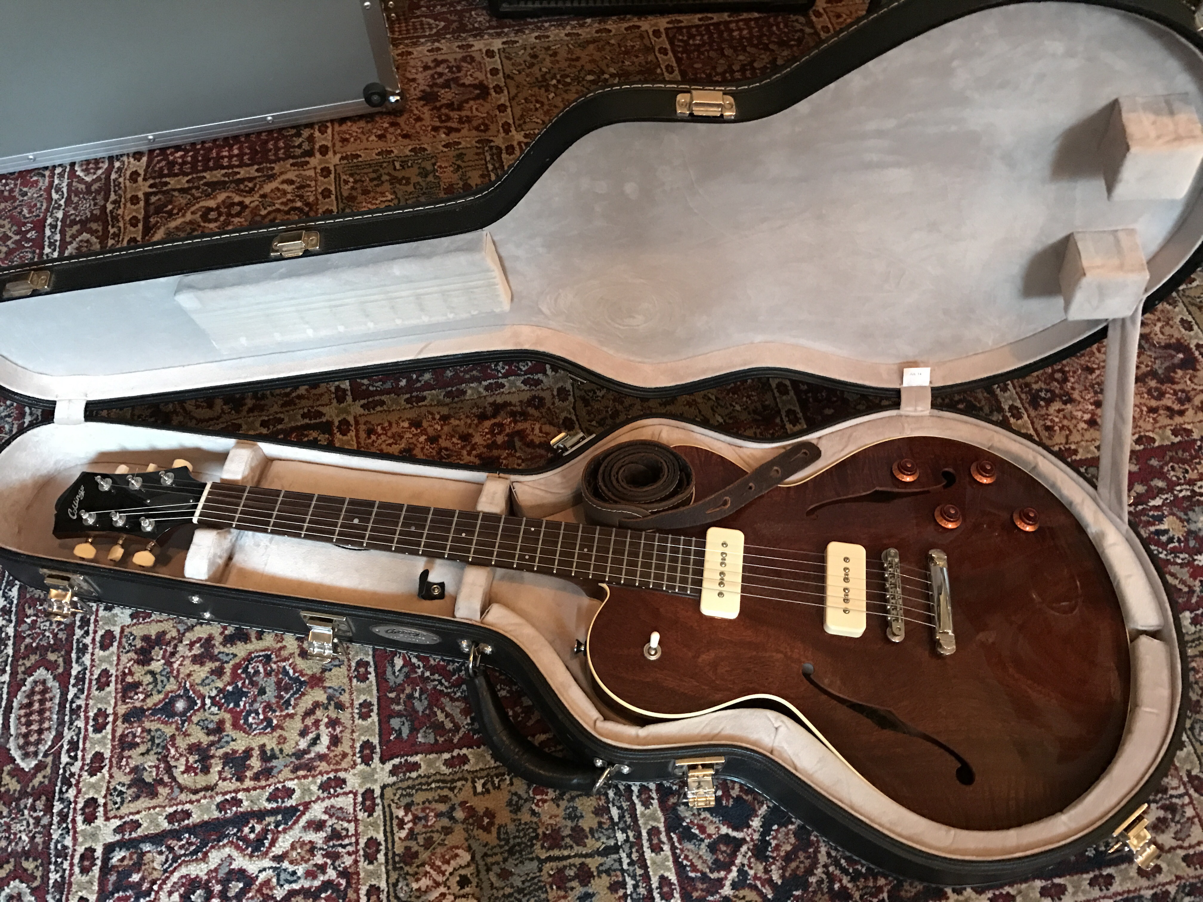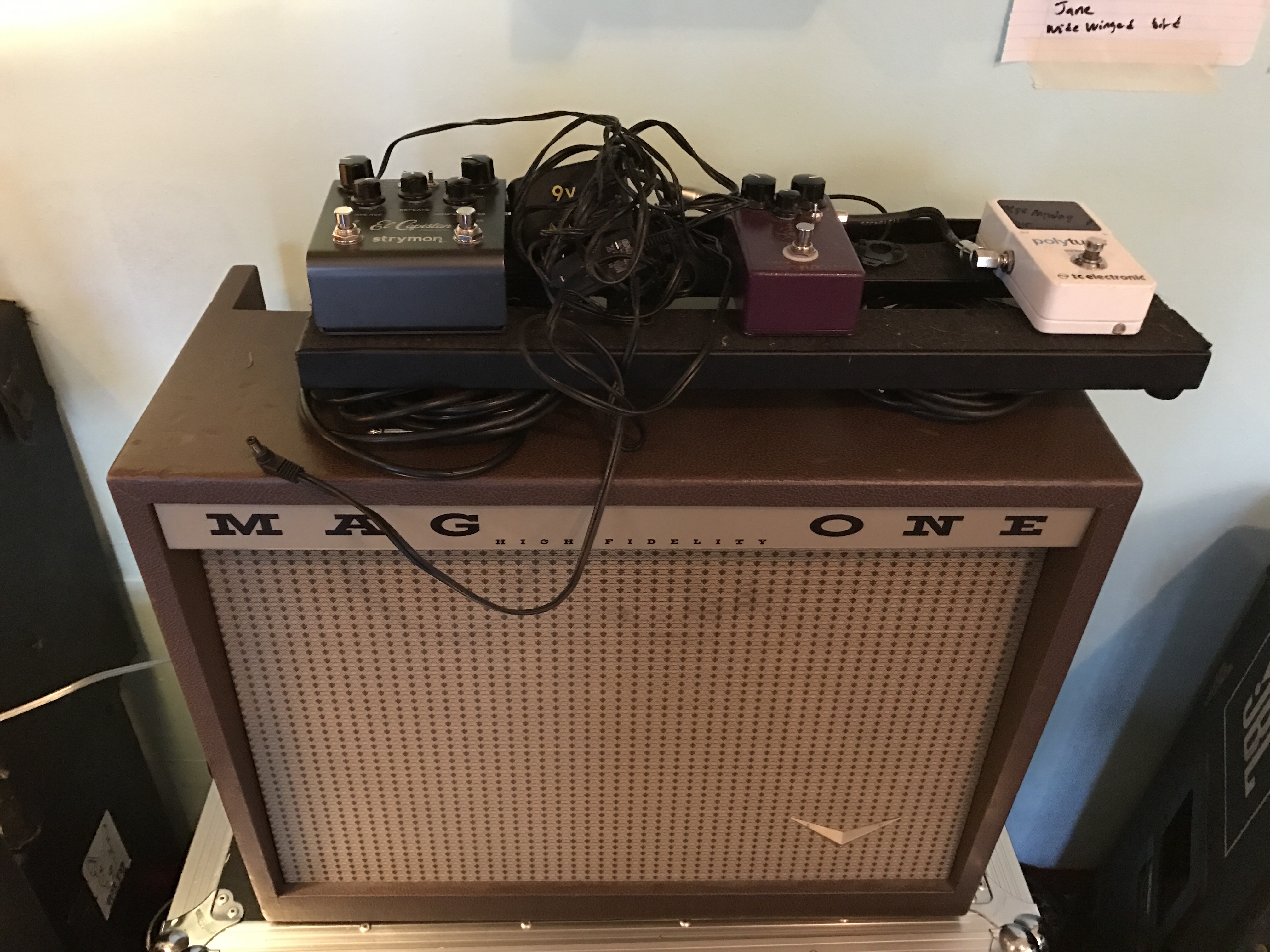 Magnatone Twilighter amp and my pedalboard: I think this is the best amp in the world. I use a Strymon Capistan tape echo pedal, an Analogman Prince of Tone, and a tuner.