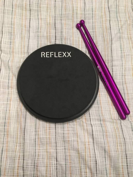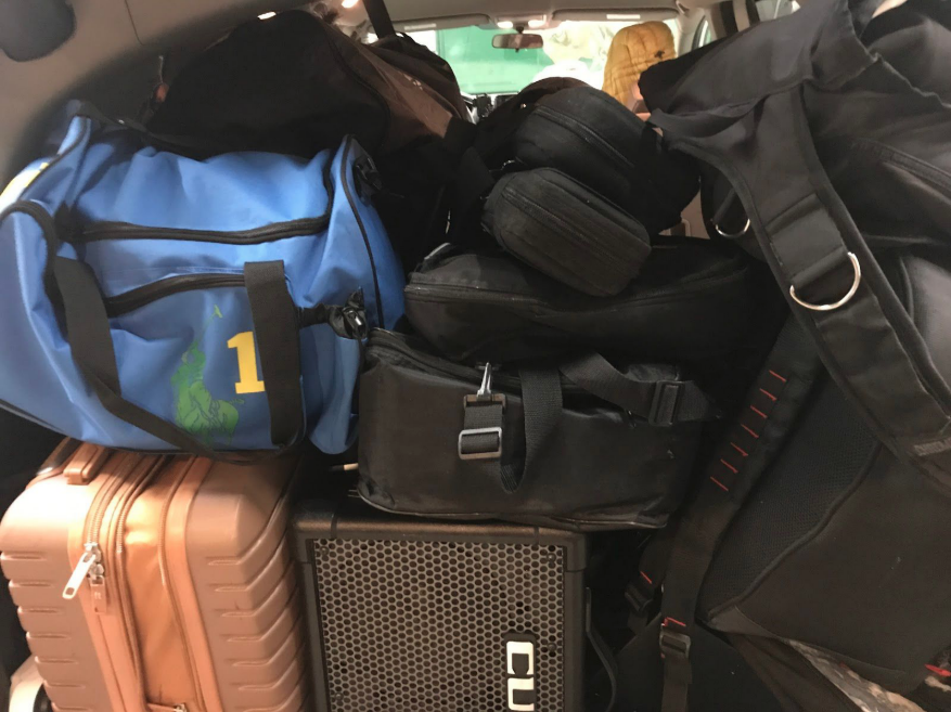 Cory, our drummer, has a skeleton drum kit that’s easy to take on the road. It’s simple and can be set up easily at venues that don’t have a backline. He also has a practice pad and metal sticks to help exercise his drum muscles and sharpen his skills during downtime.