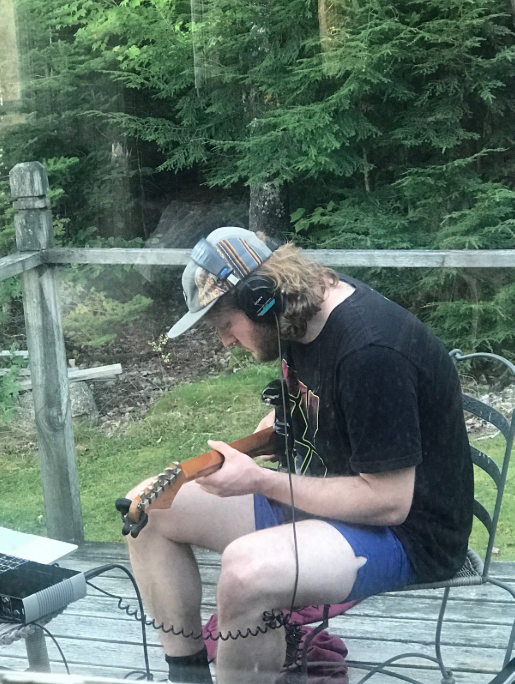 SETUP TO PRACTICE ON YOUR OWN: Robbie, our guitarist, likes to practice and write when alone so headphones, an interface for his laptop, and a small keyboard or electric guitar allow him the time and quiet to practice on his own — and he doesn’t bother other people either.