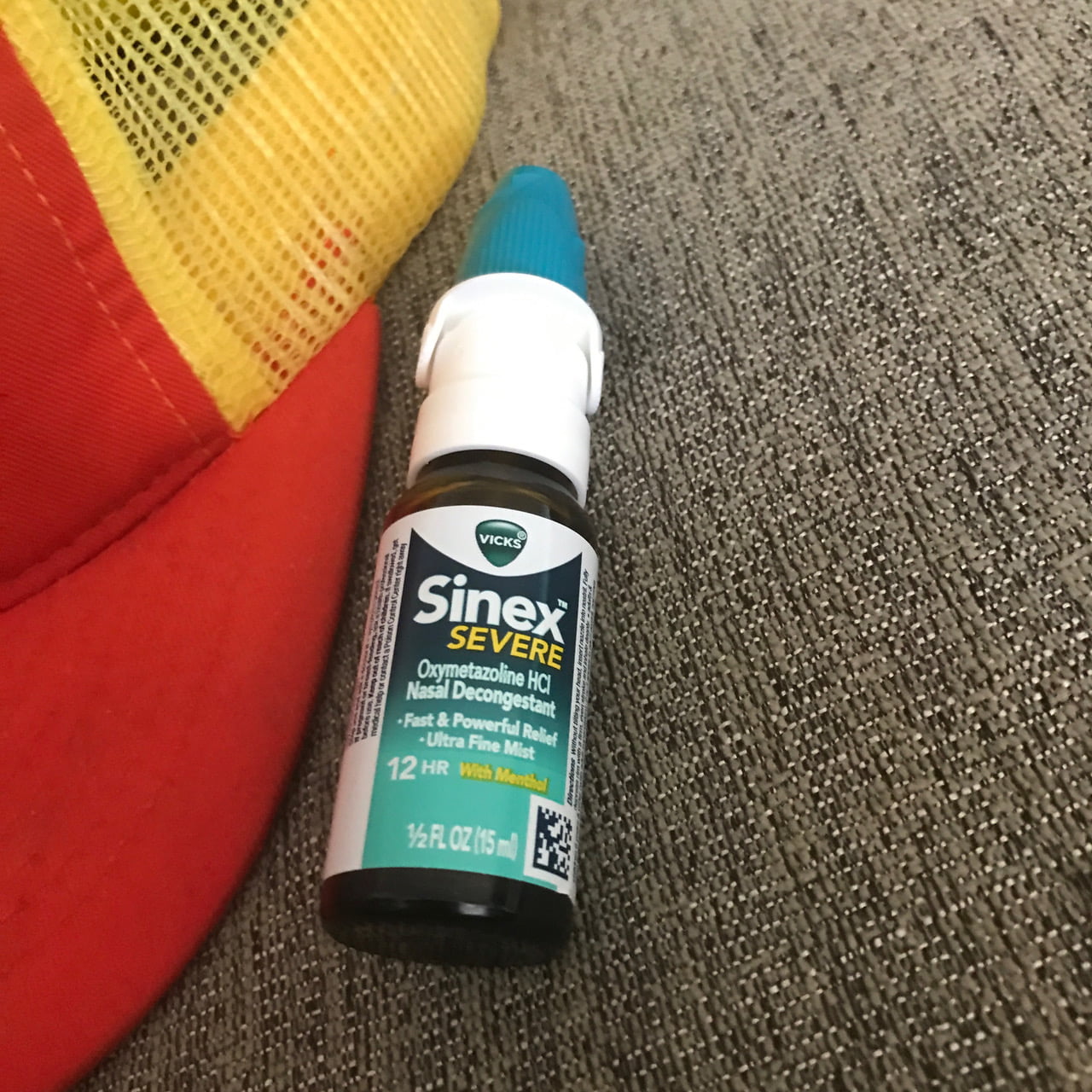 Sinex: It’s nasal spray. I’m totally addicted to it. I don’t care. I need it.