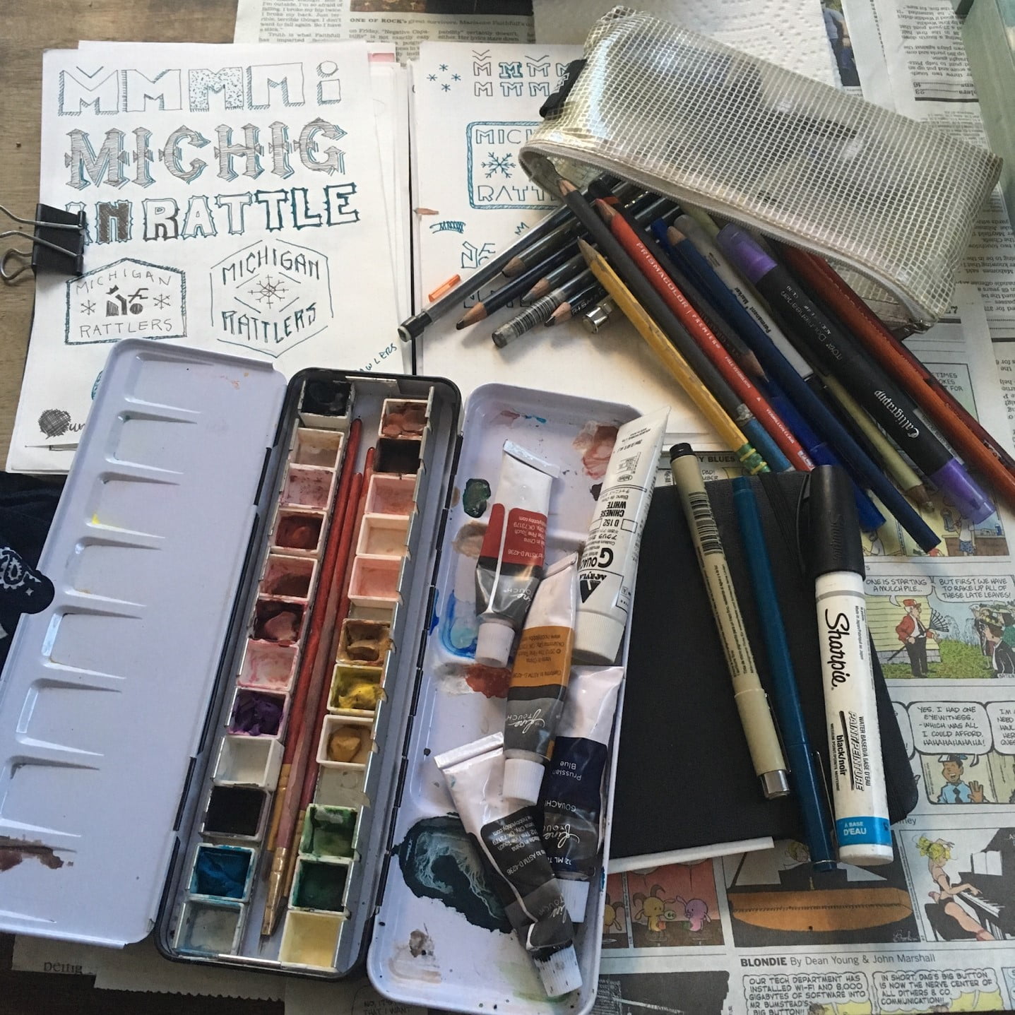 So are notebooks. There are pens and markers all over the van. Plus, Adam Reed paints and draws. He designs a lot of our merch and stuff while we’re out on tour.