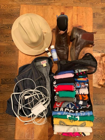 I also bring one really sweet Japanese raw denim shirt. I’ll wear it for the whole tour and it’ll always break in and fade nicely.