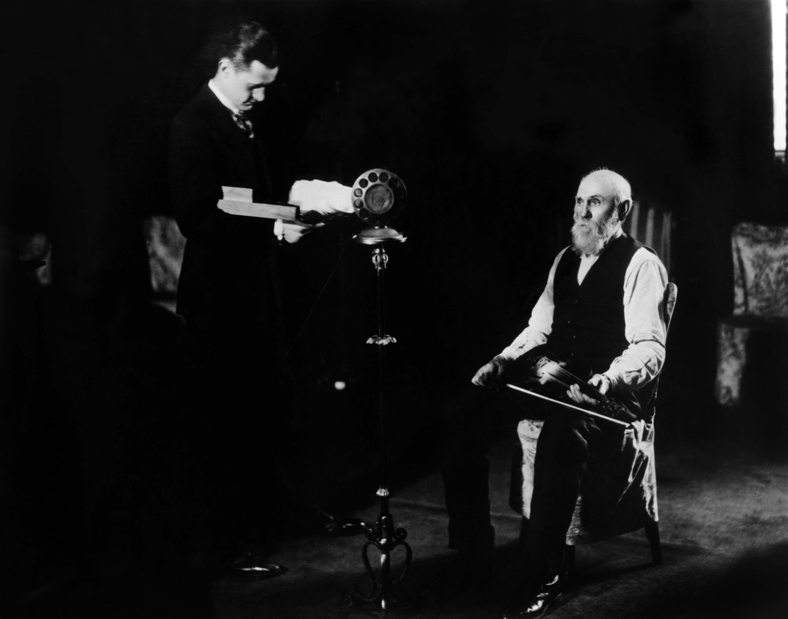 George D. Hay is pictured at microphone with a whistle and Uncle Jimmy Thompson is seated in this 1925 photograph from when the Grand Ole Opry was still the WSM Barn Dance. Photo courtesy of Ryman Hospitality Properties.