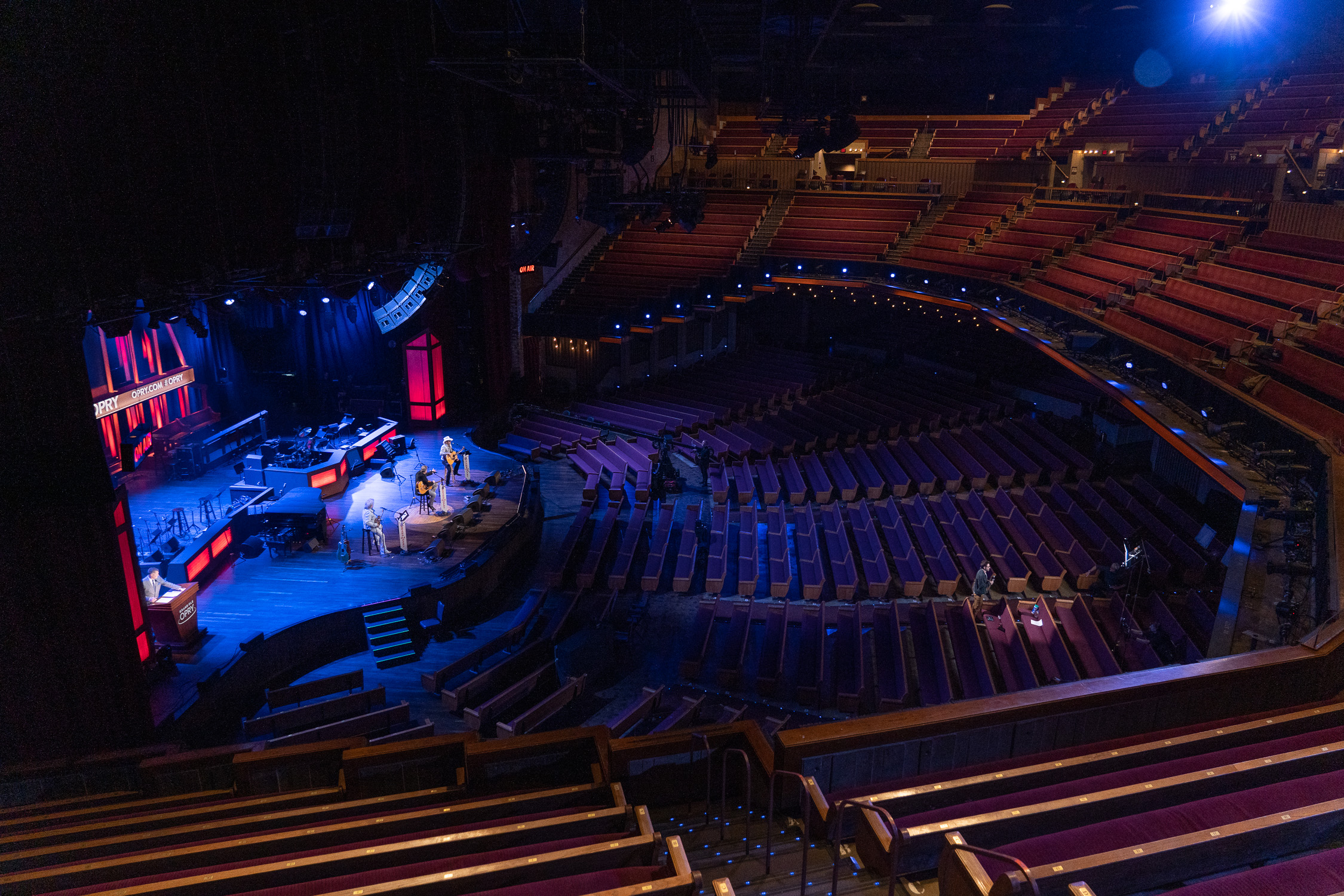 Marty Stuart, Vince Gill, and Brad Paisley perform for an empty Grand Ole Opry House during the COVID-19 lockdowns in 2020. Photo by Chris Hollo, courtesy of Ryman Hospitality Properties.