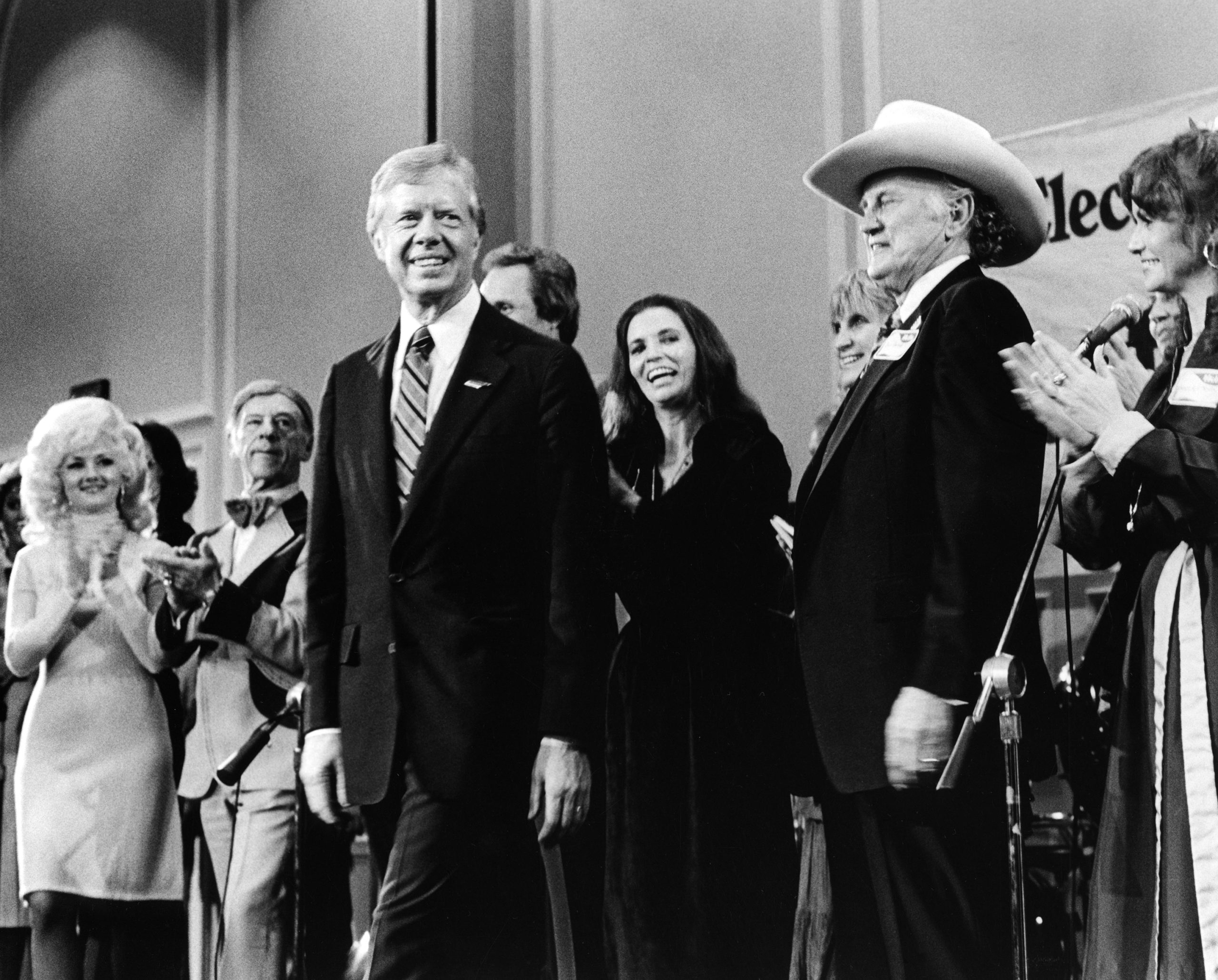 President Jimmy Carter on the Grand Ole Opry stage with Kelly Foxton, Hank Snow, Mel Tillis, June Carter Cash, Skeeter Davis, Bill Monroe, Jeannie C. Riley, and others on October 9, 1980. Photo courtesy of Ryman Hospitality Properties.
