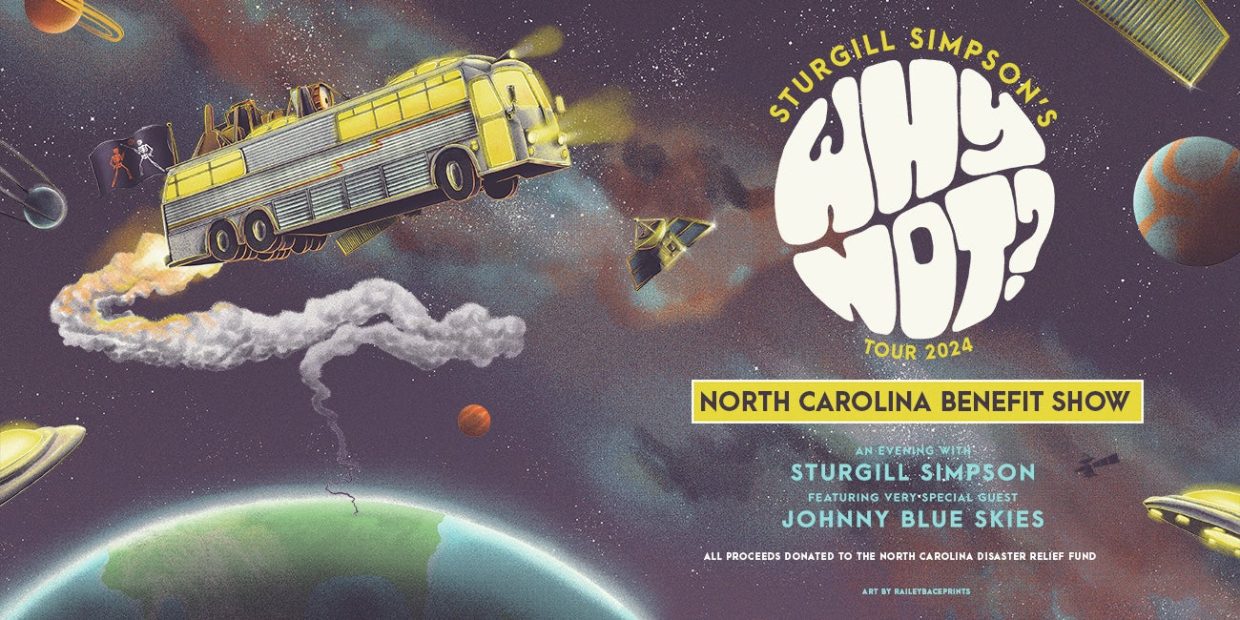Mainstream country outlaw Sturgill Simpson has just announced his Why Not? tour – featuring his new project and persona, Johnny Blue Skies – will hold a special North Carolina Benefit Show on October 21 in Cary, North Carolina at the Booth Amphitheatre with all proceeds benefitting the North Carolina Disaster Relief Fund. Tickets go on sale this Friday, October 11 at this link. As explained in a press release announcing the event, Simpson was originally scheduled to perform at Asheville’s ExploreAsheville.com Arena on the same date, but due to the devastating impact of the storm, that show has been canceled. This quick-pivot rescheduled benefit show is just another indicator of how important North Carolina is to country and roots musicians.