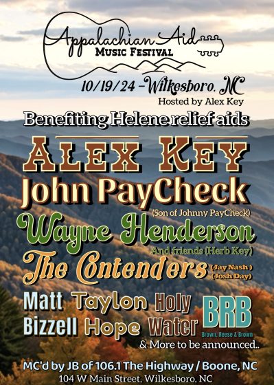 On October 19 in Wilkesboro, North Carolina, the Appalachian Aid Music Festival will feature performances by host Alex Key, John PayCheck (son of Johnny PayCheck), local great Wayne Henderson, and many more. The event will benefit Musicians Mission of Mercy, a non-profit embedded in rural Western North Carolina, specifically in Ashe County. Tickets are available now via Eventbrite, but first responders – nurses, doctors, firefighters, linemen, EMS, etc. – should know they’ll be admitted for free with their work IDs.