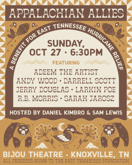 On October 27 at the Bijou Theatre in Knoxville, Tennessee an impeccable lineup of roots musicians will gather to raise funds for the East Tennessee Foundation, a non-profit committed to supporting flood victims and flood relief programs in the mountains of East Tennessee. Hosted by bassist Daniel Kimbro and singer-songwriter Sam Lewis, the event will feature performances by Adeem the Artist, Darrell Scott, Jerry Douglas, Larkin Poe, Sarah Jarosz, and more. Tickets are on sale now. Make plans to support Tennesseans by showing up and showing out for Appalachian Allies on October 27.
