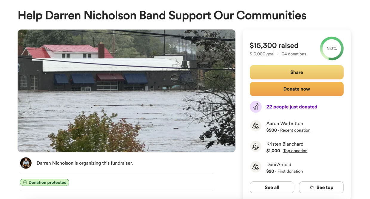 “The entire band is out serving their communities at this time,” Nicholson shares in the GoFundMe description. “Avery is a first responder doing search and rescue; Aynsley is distributing supplies in Unicoi, TN; Kevin is distributing water and fuel; Darren is cutting trees and distributing supplies in Haywood County, NC.”