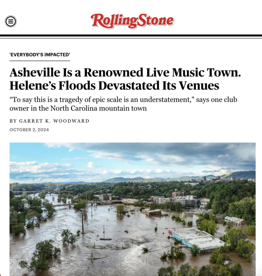 Frequent BGS contributor and freelance music journalist extraordinaire Garrett Woodward has been reporting – for RollingStone and others – from on the ground in the region about the impact on Asheville, North Carolina’s musicians and beyond. Despite dealing with power and internet outages himself, Woodward has been shining a light on the experiences of those dealing with the immense fall out of this storm.