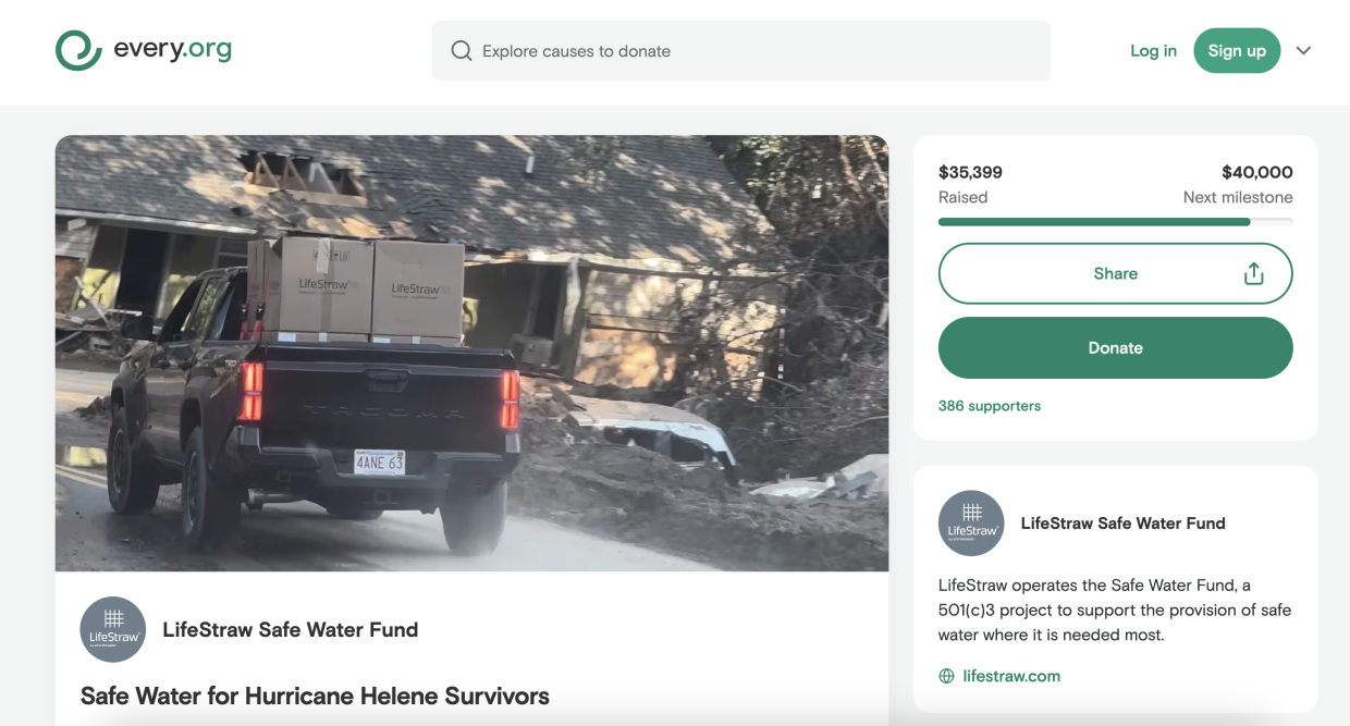 LifeStraw is a brand all about safe, clean water for all. Their products are popular with hikers, campers, outdoors people, and folks with limited access to clean water around the world. After Helene, the company activated their Safe Water Fund and their disaster response teams to bring their filtration products to those who’ve lost access to clean water. Donating directly to the fund helps bring their large purifier systems like the LifeStraw Community and LifeStraw 8L to the region as well as their LifeStraw Home pitchers and dispensers for use in homes and personal bottle and straw filters for individual use. Get more info and donate here.