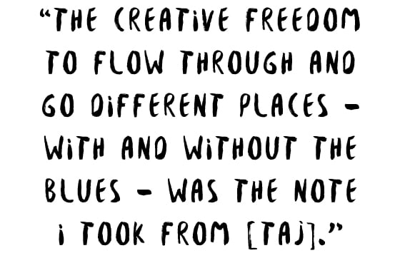The patience he brings to conversation can be seen in his work, as well. It’s a quality that helped him when it came to recording TajMo. The album took years. He recalls recording “Om Sweet Om” with friends during a party on New Year’s Day in 2015. “It was just magical,” he says about that session. “That album took a long time because we were tedious, and we were never in the same place at the same time for a lot of time. That gave me a lot of time to keep going in and listening to it, to really massage it. It gave me great perspective.” The two would exchange songs, deciding which to include, before Keb’ recorded them and sent them back. Then they’d get together to record the vocals, harmonies, and guitar overdubs.