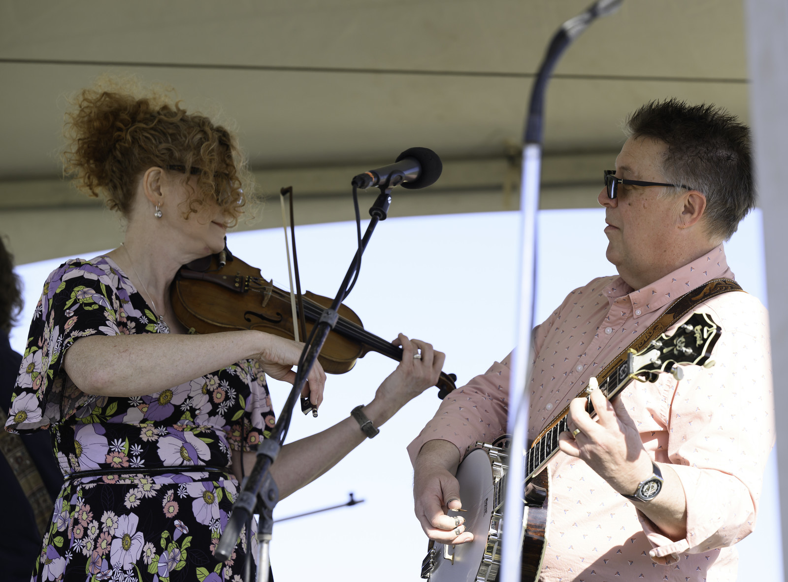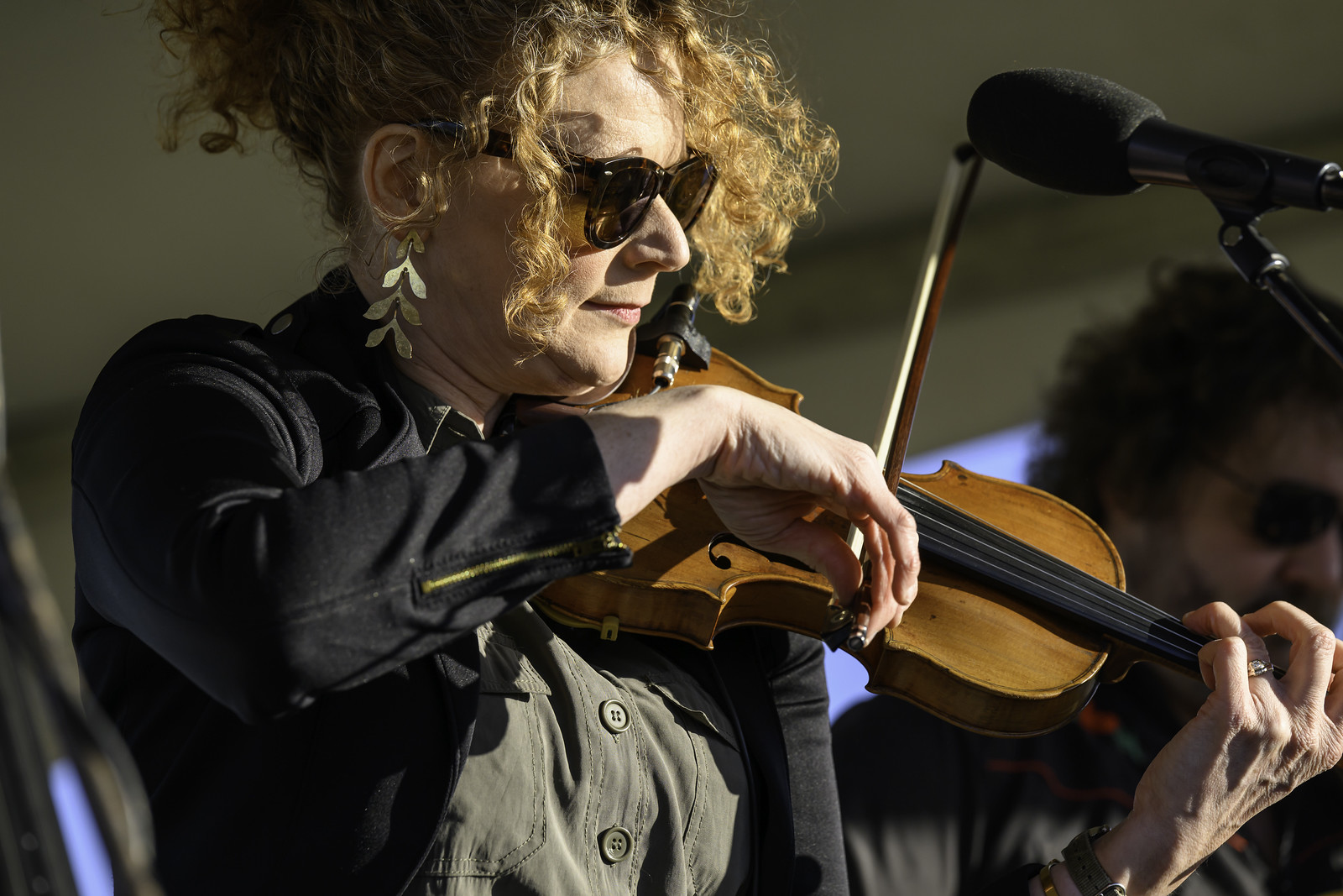 Saturday’s headline group was the Becky Buller Band. Band members had been slated to lead workshops during the lunch break, but due to the crapshoot that is airline travel they were unable to get to the venue in time. However, they did an engaging set to close out a beautiful evening. Fiddler and band leader Buller led her outstanding fellow musicians through a performance of the song cycle of her newest album, Jubilee, with its message of hope, survival, and healing. This, together with some bluegrass-ified versions of Simon & Garfunkel and Joni Mitchell, contributed a more contemporary feel.