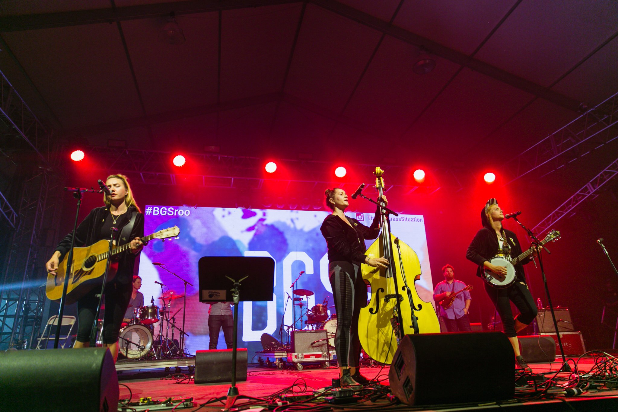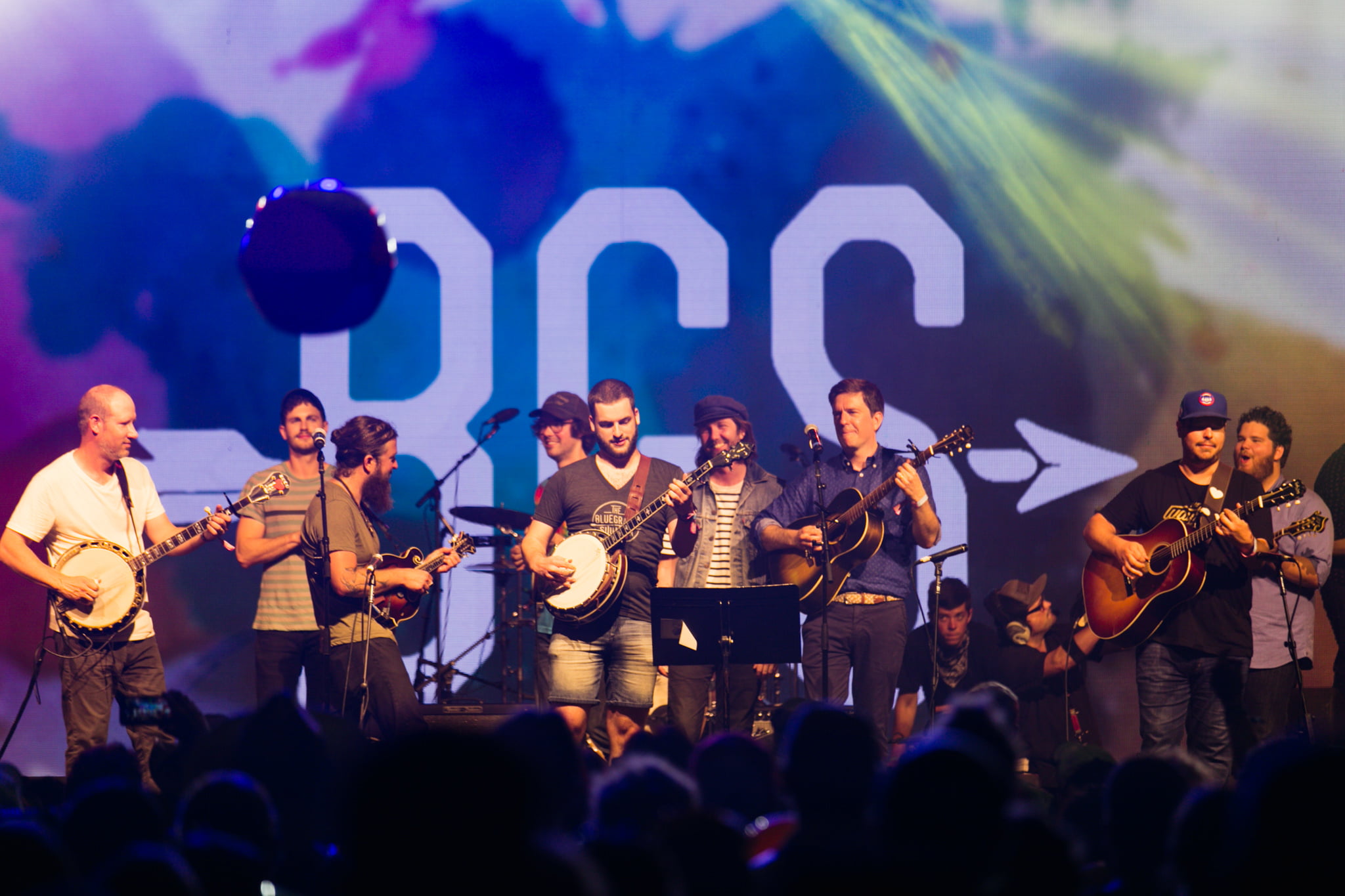 As Greensky finished their set and exited — to one more round of thunderous applause — dozens of stagehands, artists, and musicians descended, transforming the stage in minutes. The lights came down and the crowd cheered as the Bryan Sutton Band (seriously, could there be a better house band?) tore into a bluegrass medley of “Walkin’ Across This Land” and the burning instrumental “Cricket on the Hearth.” Then, to cheers and hoots and hollers and whistles, Bryan introduced “Andy Bernard” and “Captain Underpants” — aka BGS co-founder and our SuperJam host, Ed Helms. Ed sang Doc Watson’s bluesy “I Am a Pilgrim,” before welcoming back River Whyless to play CCR’s “Fortunate Son.” Baskery, a Swedish Americana (Swedecana?) trio who had performed earlier in the day at the New Music on Tap Lounge were next, performing a bluegrass-tinged, folky cover of Paul Simon’s “Graceland.”