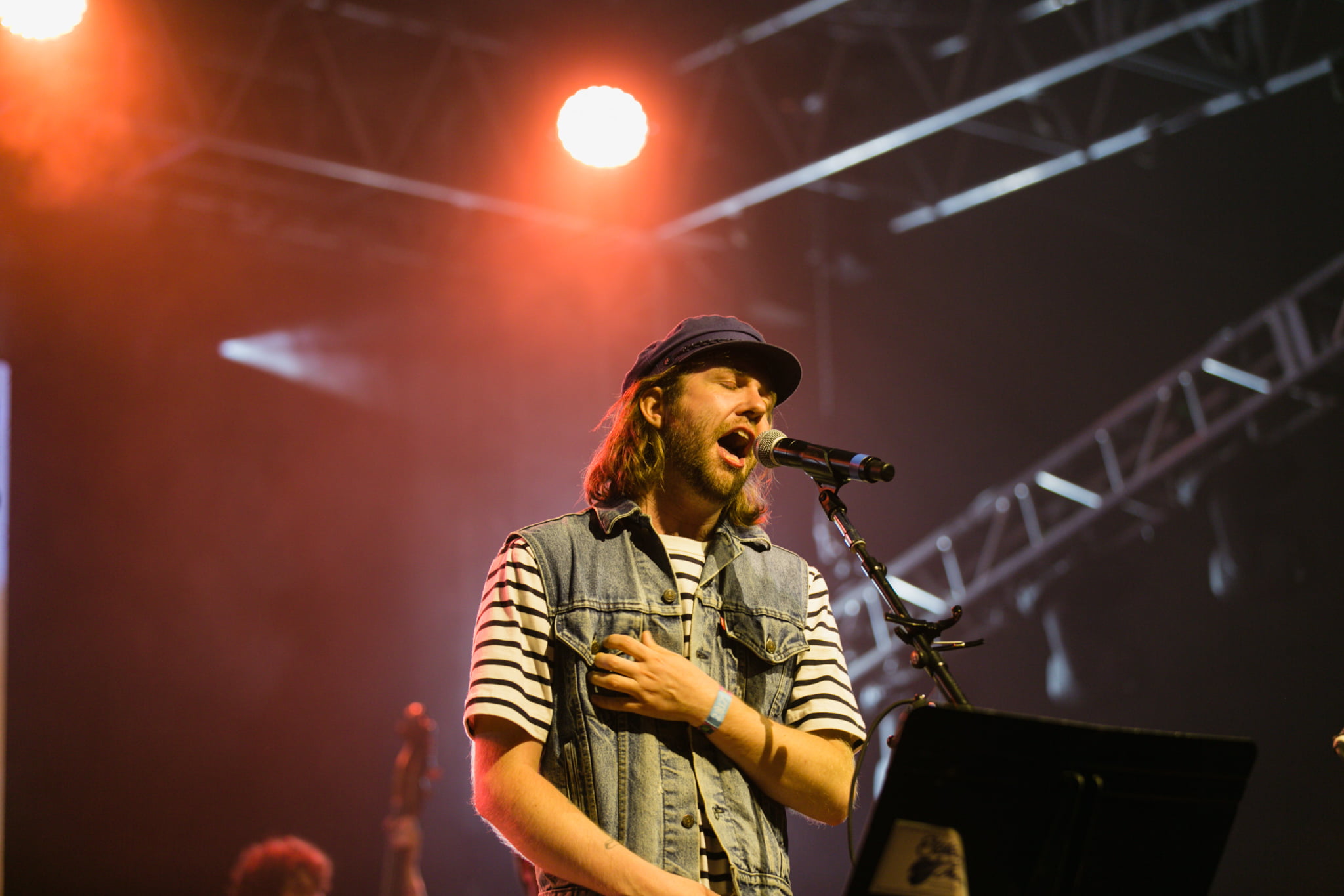 Our longtime friends Mandolin Orange came third, playing with a full band — Emily Frantz in pure white head to toe, looking summery and fresh despite the now-ridiculous temperature, and Andrew Marlin lending festival cred to our entire operation with his rainbow tie-dye tee. They sprinkled old favorites in and among songs from their latest album, Blindfaller.