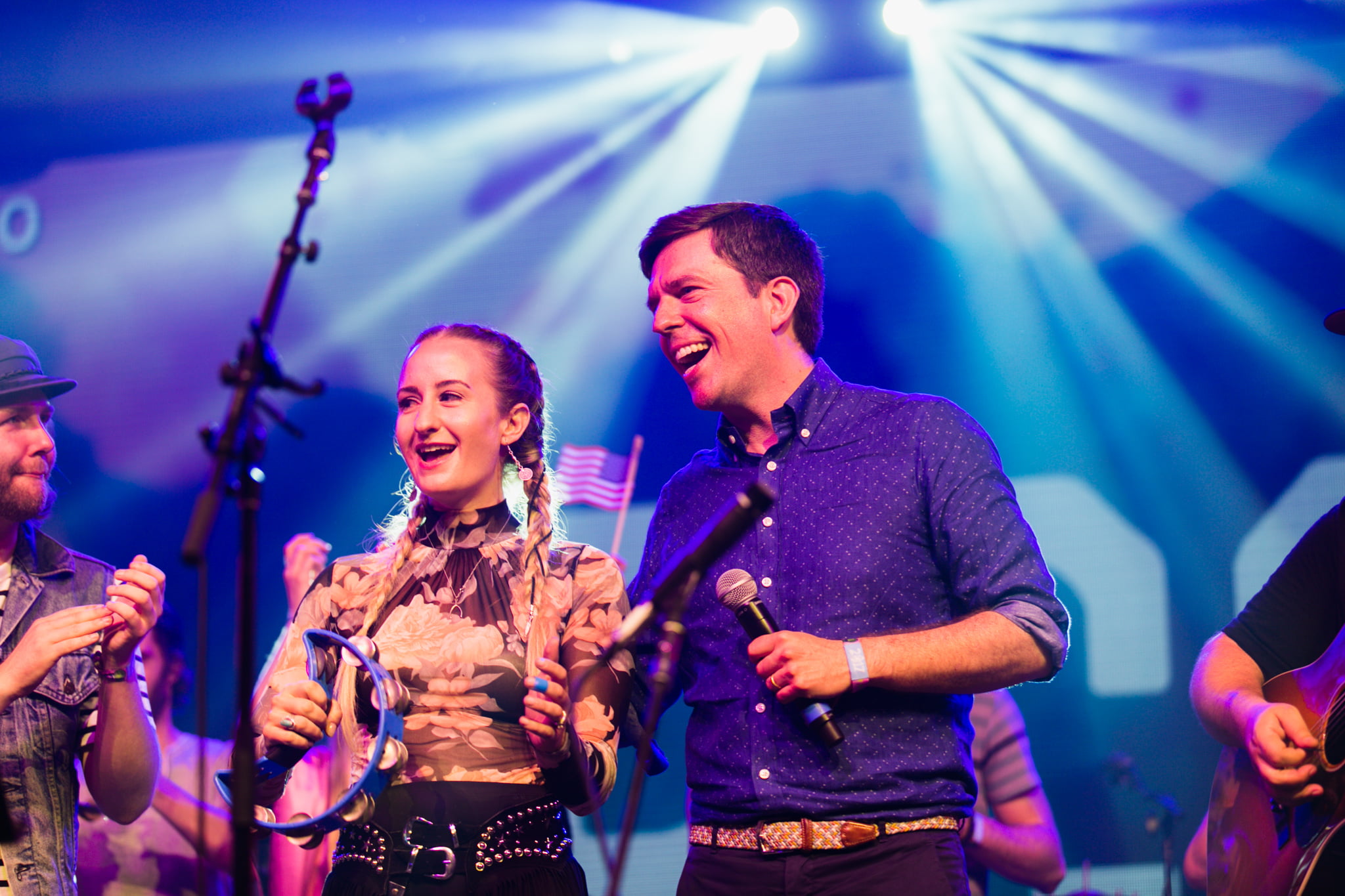 And if that wasn’t exactly what the world needs right now, then it must need John Mellencamp. Right out of “God Bless the USA,” Bryan Sutton morphed the song into “R.O.C.K in the USA.” Last-minute, surprise guest Margo Price sang a verse and rocked out on tambourine with long-time friend Aaron Lee. The musicians all traded solos, launching a friendly musical battle between Greensky’s Anders Beck and Paul Hoffman, as Gaby and Martina shouted along and U.S. flags still waved. Then, Ed signaled the band to drop out, leaving just the crowd singing, jumping up and down with beach balls flying — and our fifth annual Bluegrass Situation SuperJam hosted by Ed Helms came to a close.