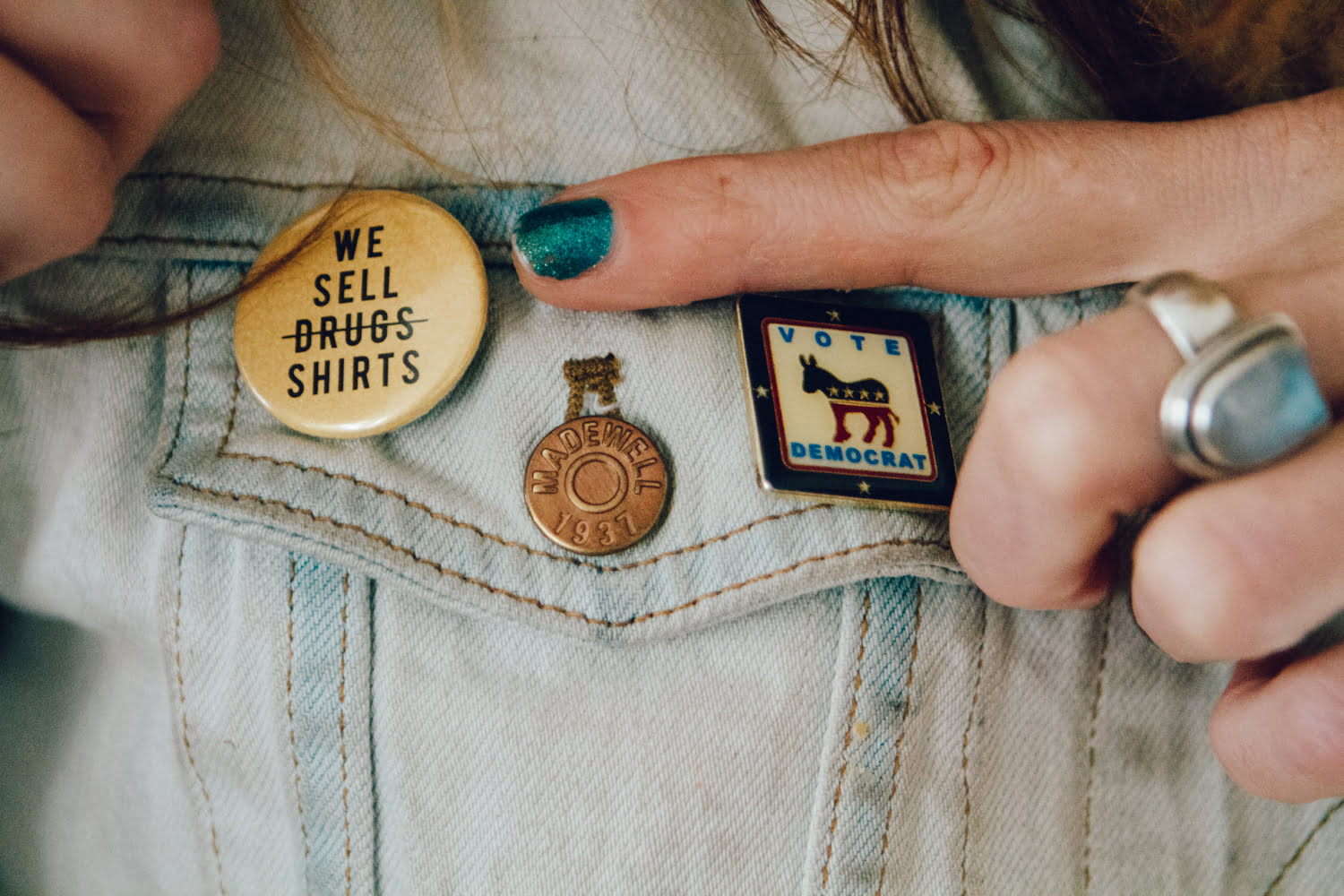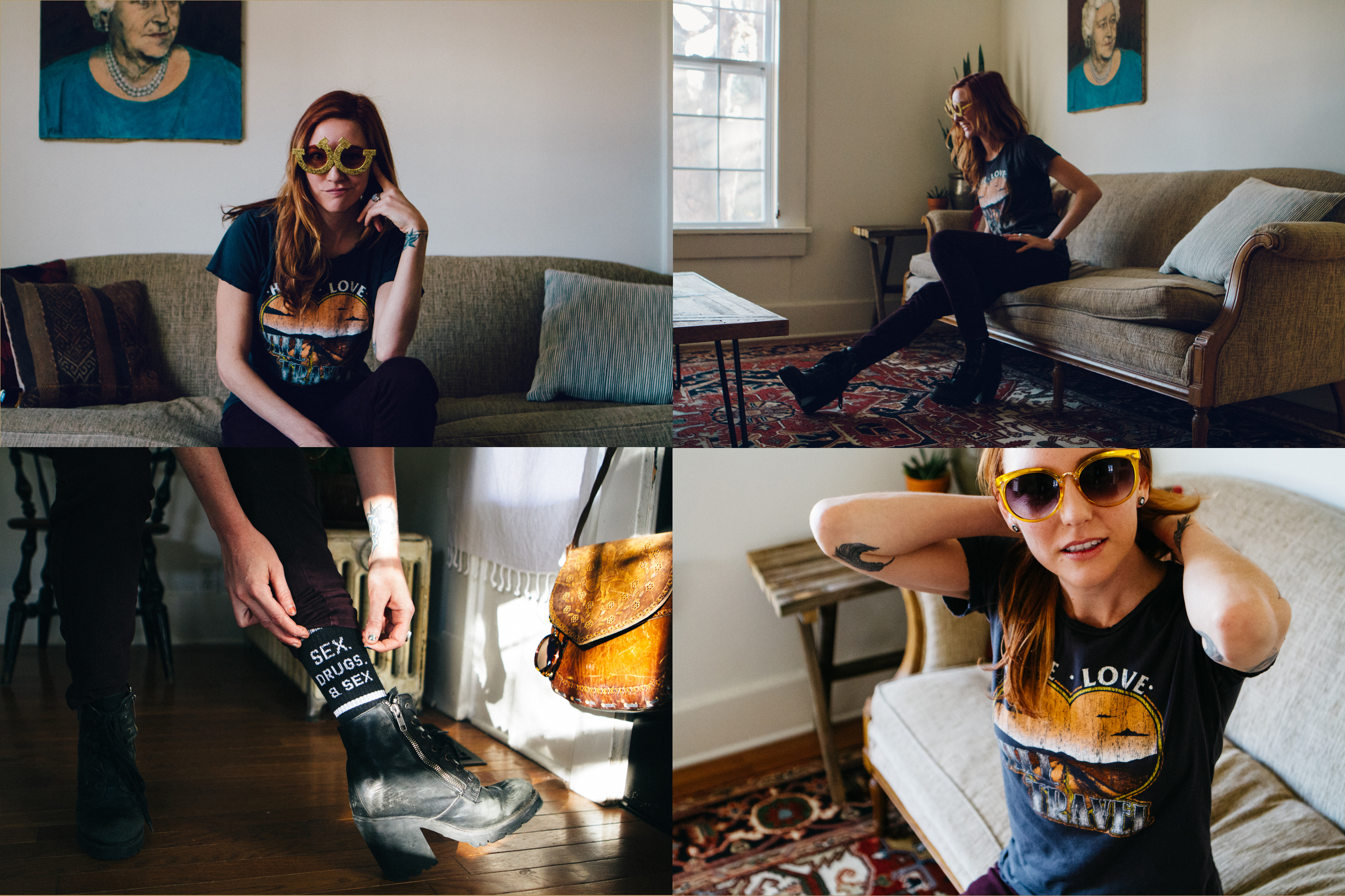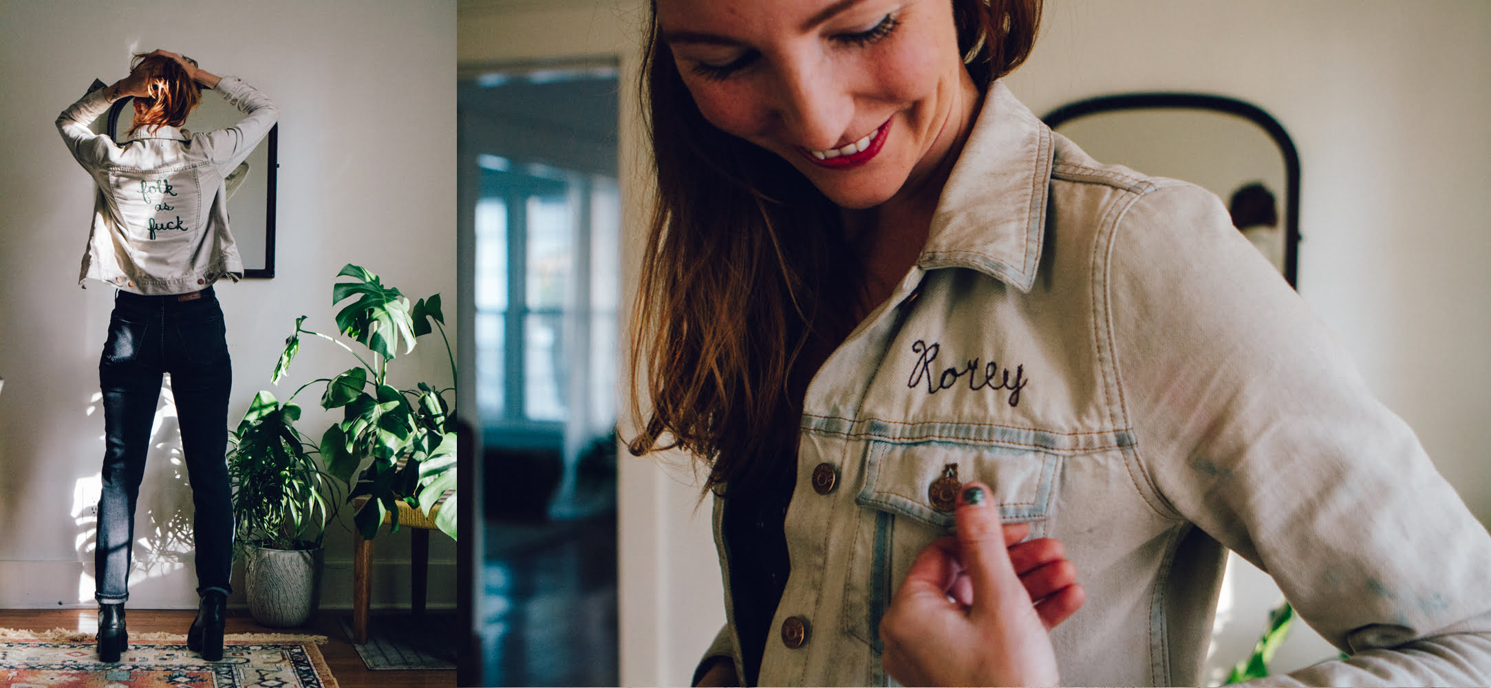 I love that nothing confines Rorey to one look. She freely roams in and out of cool, sexy, goofy, conservative, and folky … without effort. She’s comfortable expressing all sides of her personality. So, if she wakes up feeling particularly cold-blooded, you may see her running around town in a shark unitard. However, most days you’re likely to see her sporting her staple black-heeled boots and denim jacket embroidered with her signature satirical phrase, “Folk as Fuck.”