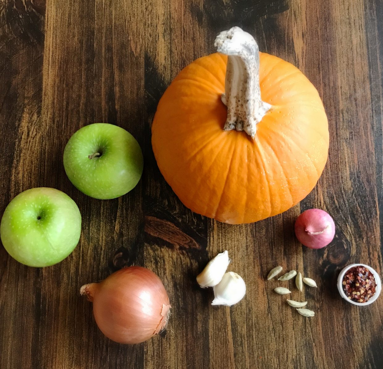 Place pumpkin, apples, shallot, and onion into a blender or food processor, and blend until smooth. Some minimal texture is fine. Pour contents of blender into pot of coconut milk mixture and stir. Bring stove top temperature down to simmer.