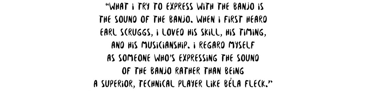But when faced with the idea that he, himself, could very well be the “What’s that?!” moment for an entire generation of brand new banjo players, he is unfalteringly modest. “What I try to express with the banjo is the sound of the banjo. When I first heard Earl Scruggs, I loved his skill, his timing, and his musicianship. I regard myself as someone who’s expressing the sound of the banjo rather than being a superior, technical player like Béla Fleck. So, if anyone picks up the banjo from hearing me, it’s because they fell in love with the sound of the banjo. What I do is get the sound of the banjo out there to a broader world, I guess.”
