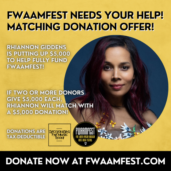 If you believe in the future of FWAAMFest and Decolonizing the Music Room and want to help it continue into the future, you can donate now on the official festival website. Additionally, banjo player, songwriter, and scholar Rhiannon Giddens has pledged a $5,000 matching donation if two or more high level donors give at that dollar amount. If you have the resources, consider devoting funds to the important and vital mission of FWAAMFest and DtMR.