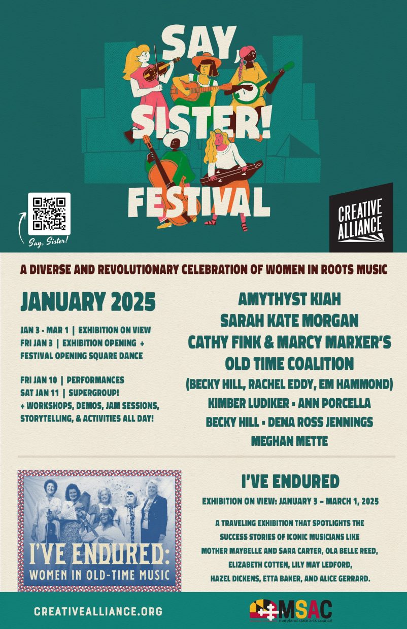 Say Sister! Festival takes place in Baltimore, Maryland at the Creative Alliance on January 10 & 11, 2025. Tickets – in person and “watch from home” – are available here. The “I’ve Endured: Women of Old Time Music” exhibit opens at Creative Alliance on January 3 at 6pm.