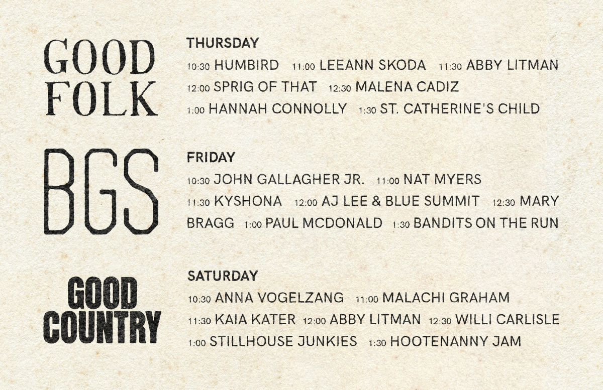BGS will be on hand for FAI 2024, as well! With our friends from Good Folk we’ll be hosting “The Good Room” (#717 at the Westin) featuring three nights of music celebrating Good Folk, BGS, and Good Country. See artists and performers like Nat Myers, Willi Carlisle, Kyshona, AJ Lee & Blue Summit, Humbird, and many more Thursday, Friday, and Saturday nights at the conference. (Full schedule below.)