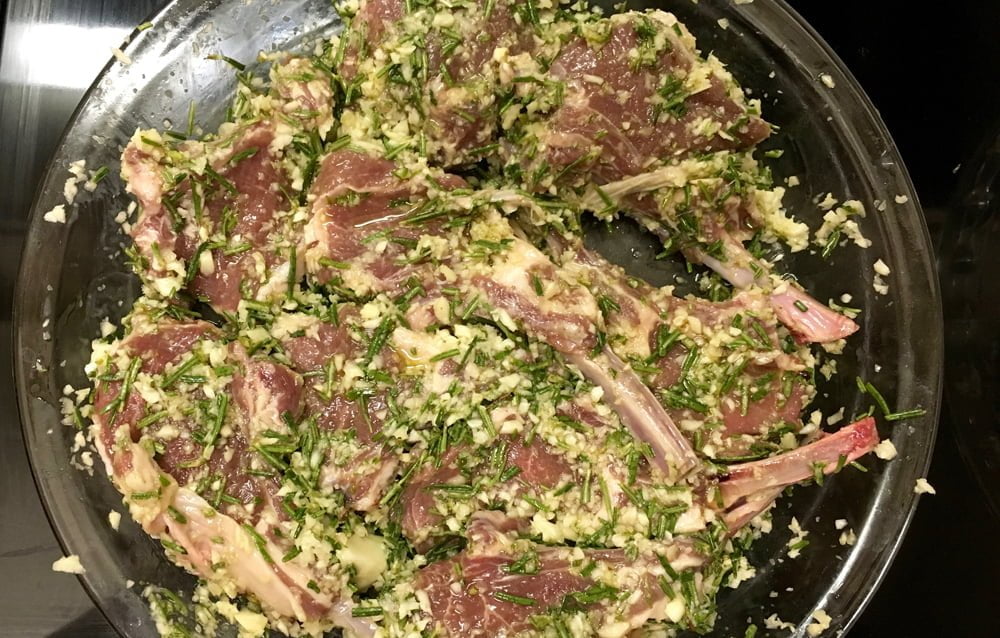 Use a very sharp knife to slice the lamb into individual chops. Set to the side. Combine the chopped garlic, rosemary, lemon juice, and olive oil in a bowl, toss the chops in, and coat them. Then lay them in a single layer in a flat glass container and cover them with the marinade from the bowl. Refrigerate for at least 24 hours.