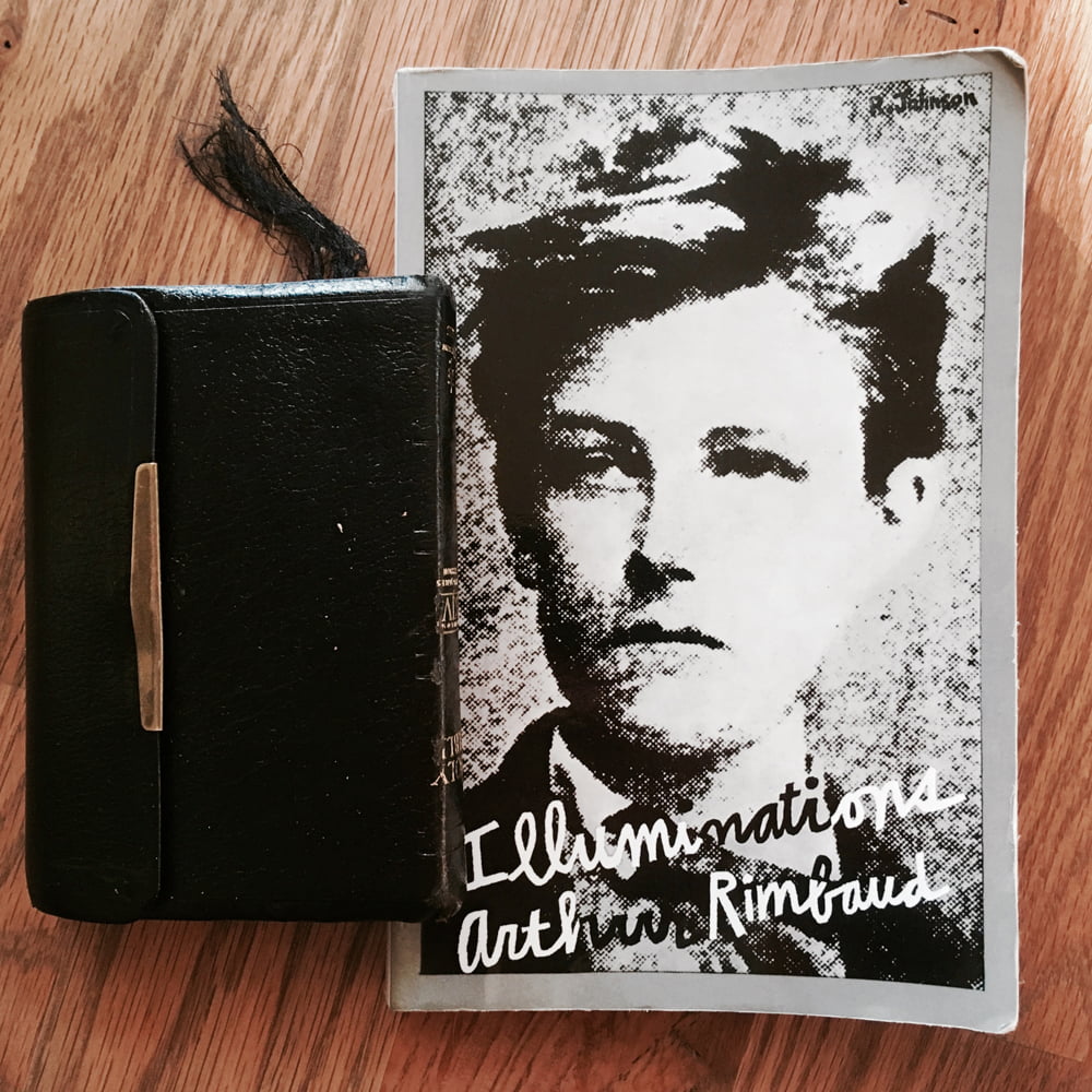 World’s Tiniest Bible™ and Illuminations by Arthur Rimbaud: Shown in tandem to emphasize their contradictory natures. I’ve had this Bible for ages, but I can’t read this copy because the print is too small. The print is tiny. It came with a credit card-sized magnifier — seriously, you can’t read it without it — but I lost it. I carry it as a good luck charm.