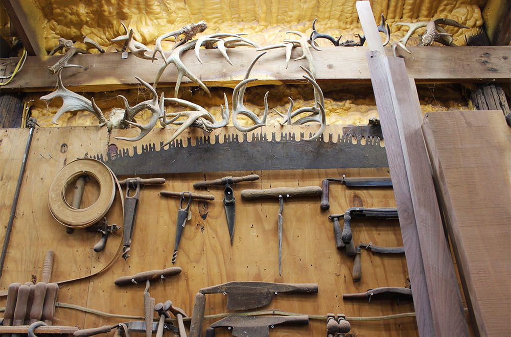 Stine’s clientele includes well-known names, household names even — Michael J. Fox and Andrew Sullivan to name a couple — but he seems much more interested in his day-to-day work within the shop just down the way from his home, and in those family members or comrades that visit or live on the farm and land. His clients respond to his work, to say the least … work done on the family farm. This isn’t a mere commodity. Stine adores what he does, knowing it’s good and true art he makes. He has intense eyes, like those of a wild, early explorer of America, the kind that can pierce through rhetoric and bullshit, yet he is inviting, kind. And, yes, Stine’s beard — long and thick — is something to reckon with. He is a giant in every sense of the word.