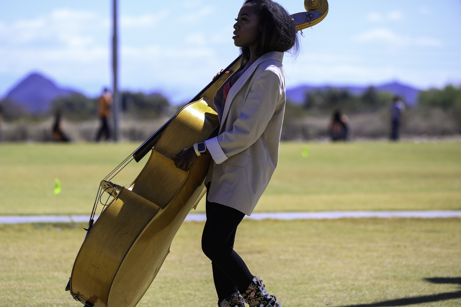 Joelle Tambe-Ebot heads to the stage with her upright bass.