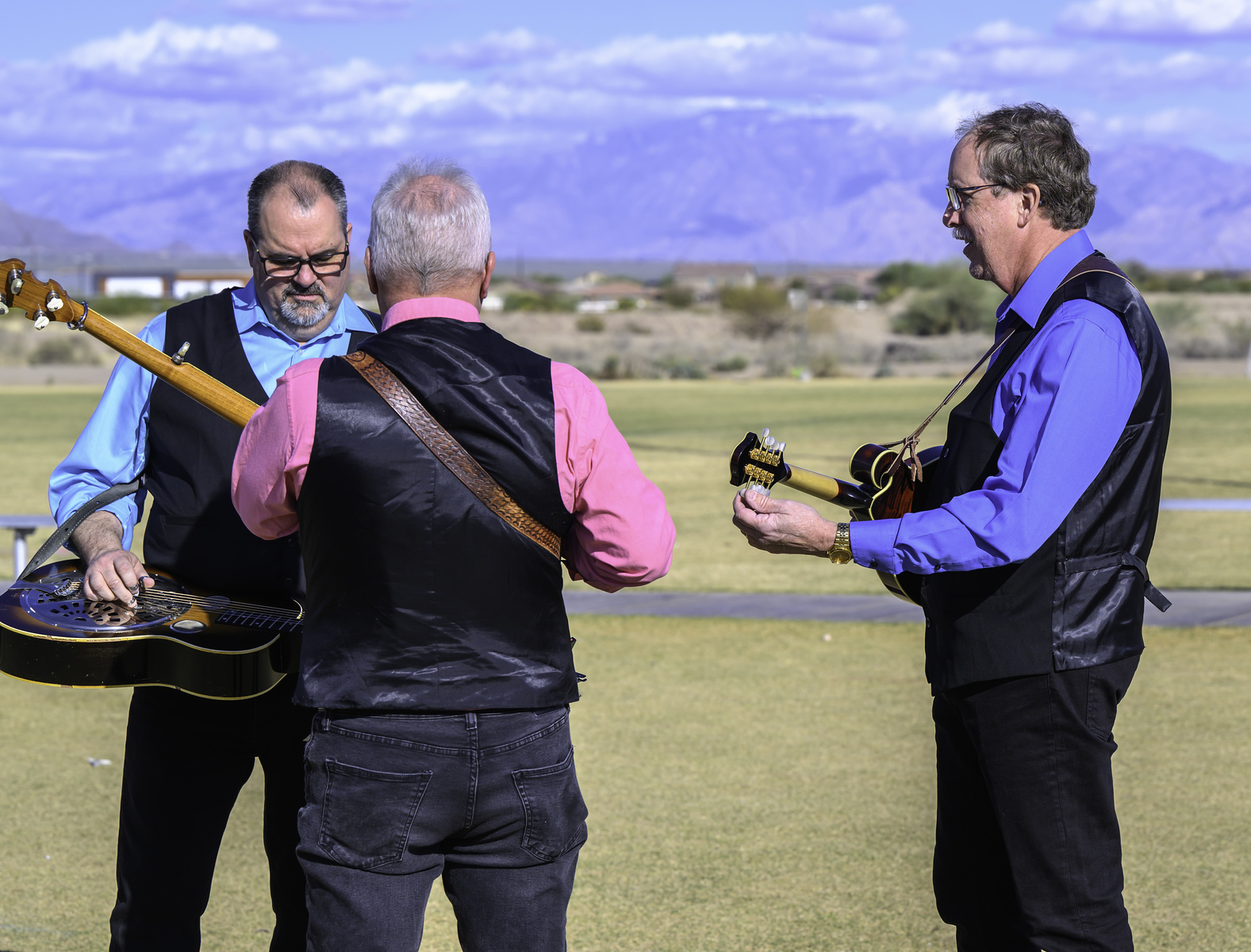 The Country Gentlemen Show tune up backgrounded by the Rincon Mountains.