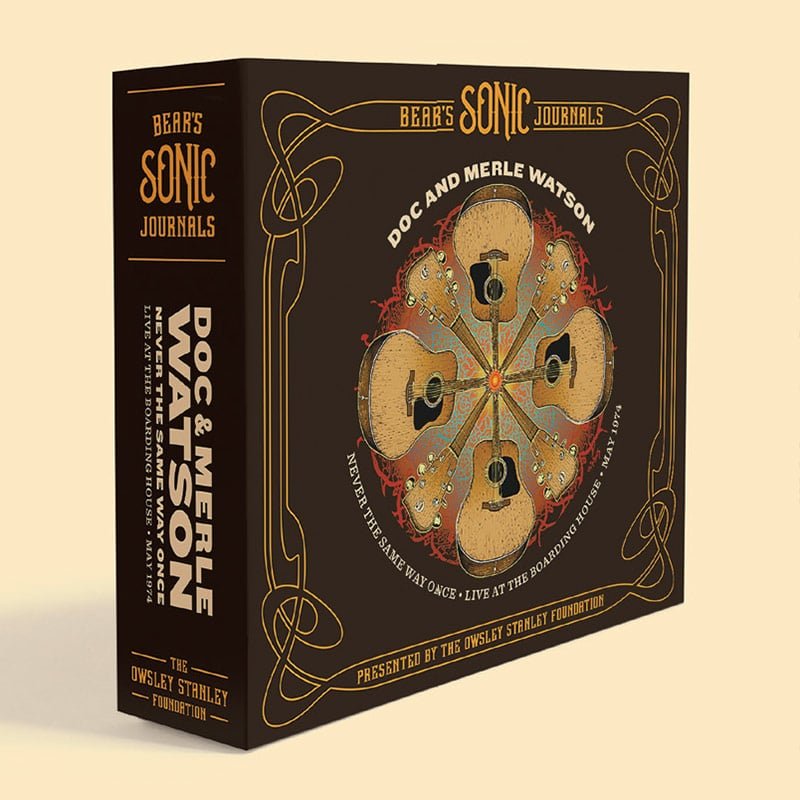 Owsley “Bear” Stanley was a hero of the psychedelic counterculture, notorious for both his production of high quality LSD and his engineering work for the Grateful Dead. (He built their famed concert sound system, known as the Wall of Sound.) But his contributions extended far beyond the psychedelic revolution. By plugging his recorder directly into the sound board and placing microphones on and around the stage, he became a transformative force in the landscape of capturing music. Upon his death in 2011, he left behind 1,300 reel-to-reel tapes of shows he recorded in venues around San Francisco in the 1960s and ‘70s. Last month, the first of these recordings — known as Bear’s “Sonic Journals” — was introduced to the world in the form of a seven-disc box set titled Doc & Merle Watson: Never the Same Way Once. Released by the Owsley Stanley Foundation, a non-profit organization founded by Bear’s son, Starfinder Stanley, the box set captures Doc and Merle’s four-night stint at the Boarding House in San Francisco in 1974.