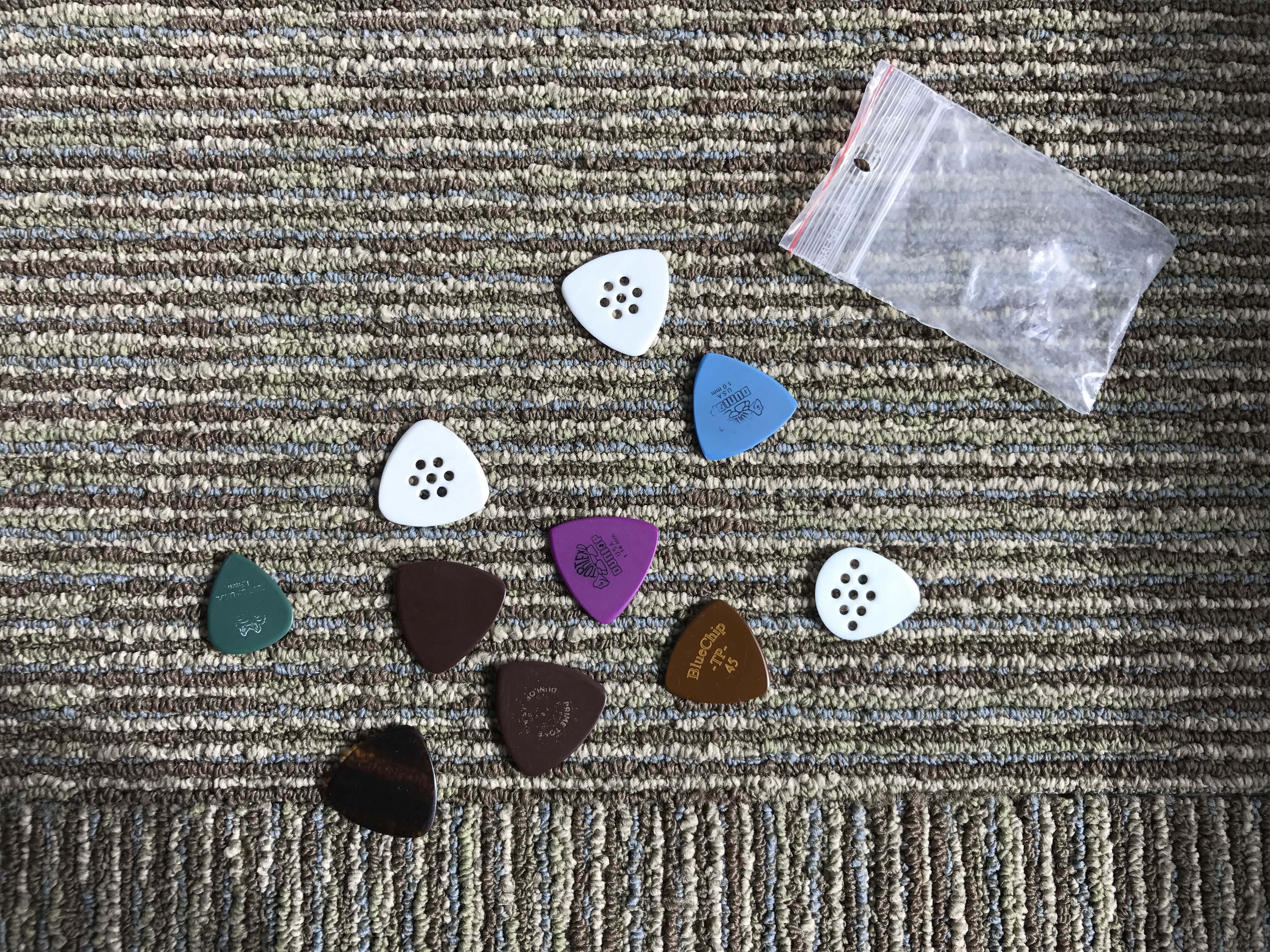 Pick sack: In true acoustic musician form, we are lost in the pick-nerd abyss. We're pretty dedicated to Wegens and Bluechips, but there's a constant evolution of weight/thickness/shape preference, etc. We come prepared.