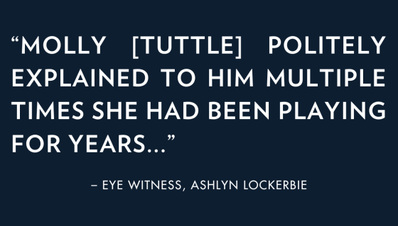 According to witness Ashlyn Lockerbie (32), the entire interaction could have been avoided. “Molly [Tuttle] politely explained to him multiple times that she had been playing for years,” Lockerbie stated. “She wasn’t even looking to buy a guitar.”