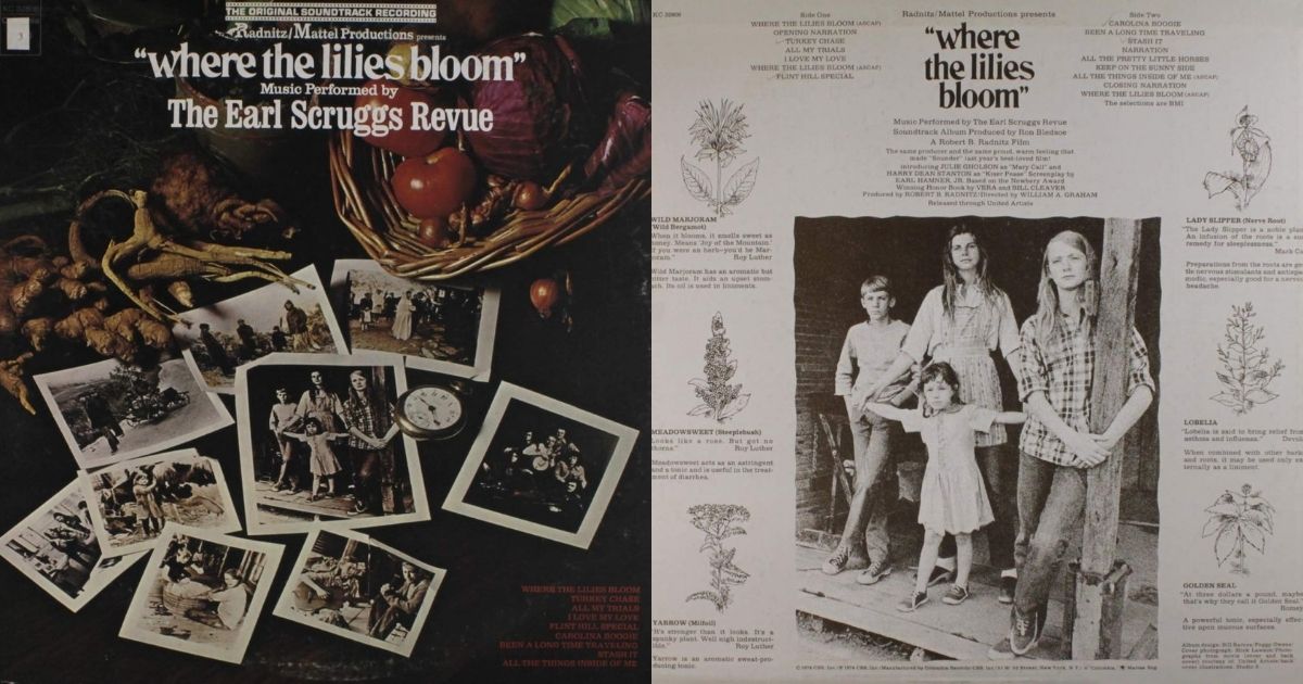 The album cover of Columbia KC 82806 announces at the top: “The Original Soundtrack Recording.” Below that comes “Radnitz /Mattel Productions presents, where the lilies bloom (all in large lowercase), then: “Music Performed by” and finally “The Earl Scruggs Revue.” All this is printed over a collage of color shots of herbs, along with nine little black and white stills from the film – one of which is the Revue.