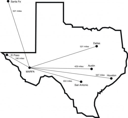 If you’re feeling a road trip through West Texas, take the six-hour drive from Austin, or fly into El Paso’s International Airport and head southeast for about three hours. Midland Airport is also a three-hour drive. Since Marfa is so rural, it’s quite the haul from larger cities in Texas.
